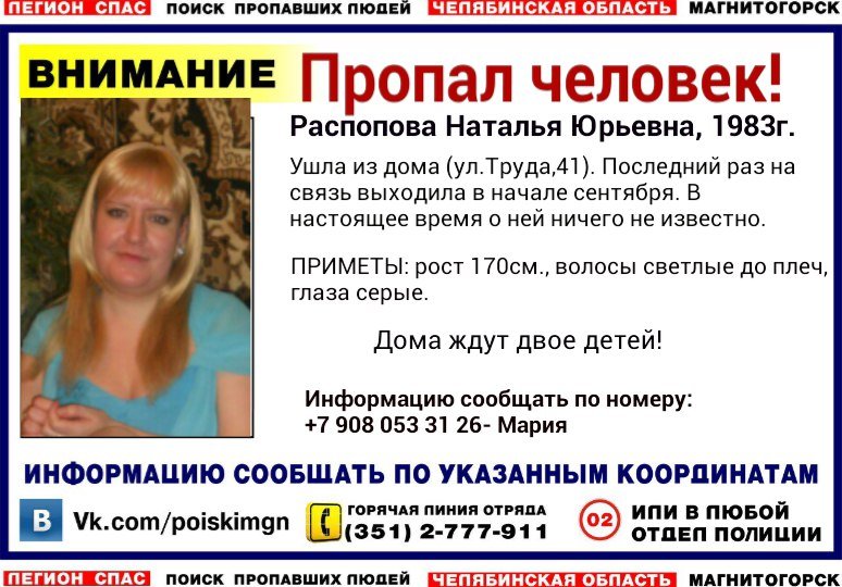 Распопова Наталья Юрьевна 1983 года рождения ушла из дома по улице Труда. Последний раз на связь выходила в начале сентября. В настоящее время о ней ничего не известно. Дома ждут двое детей! — рассказали сайту «Первый областной» в поисковом отряде