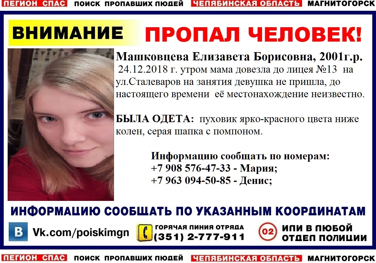 Волонтеры в Магнитогорске организовали поиски 17-летней Елизаветы Машковцевой. Школьница исчезла 24 декабря. Как рассказала мама девочки, Елизавета утром должна была отправиться на занятия в Академический лицей. До учебного заведения школьницу довезла мама. Однако в здание девочка так и не вошла, на уроках не появилась и домой вечером не вернулась.