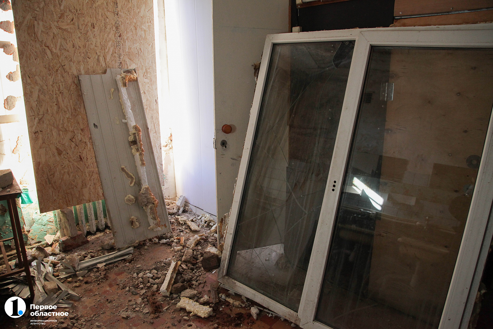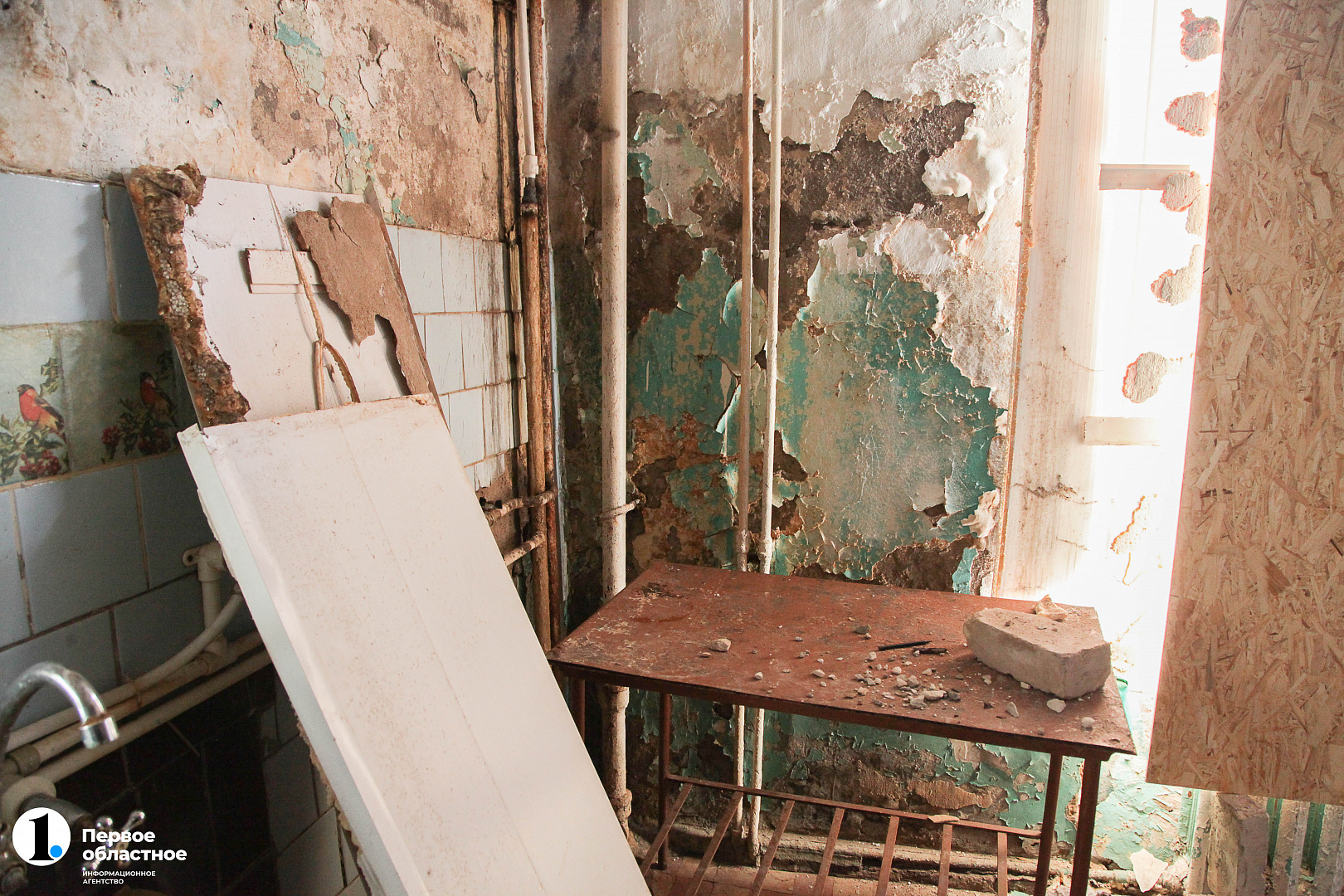 Место обрушения стены — душевая комната на втором этаже. По словам жителей дома, помещение топило с третьего этажа регулярно. И вот проблема достигла апогея — кирпичи, напитавшись влагой, набухли и просто начали вываливаться из стены.