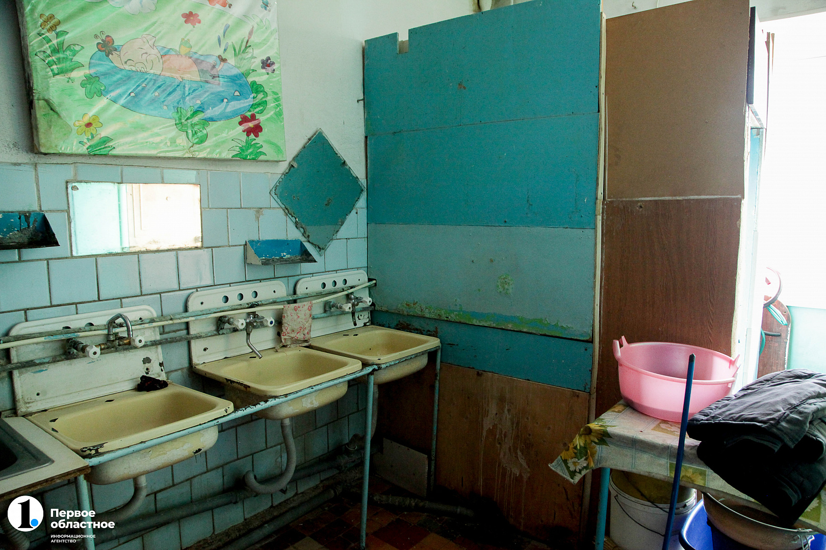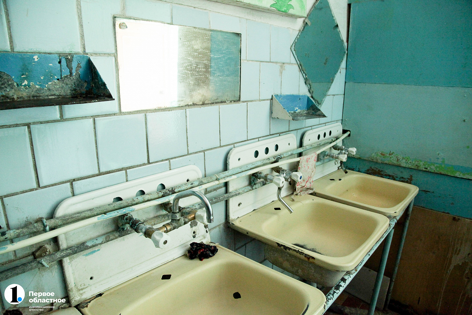 В пострадавшей комнате с незамысловатым названием «Умывальник» на стареньком кафеле стоят стиральные машинки, раковины. На обшарпанных стенах — два зеркала.