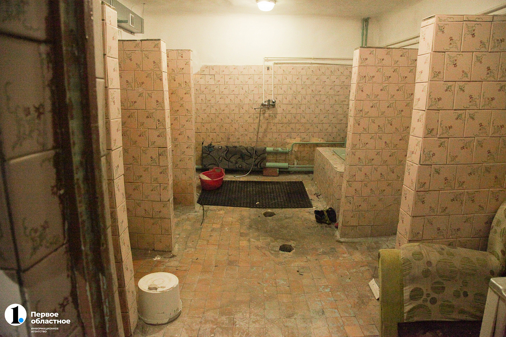 Жительница провела нас внутрь здания. Мы спустились по лестнице в подвал. В нос ударил гнилостный запах. Дальше по коридору вереница тазиков, тряпок, домашней обуви, в углу — искусственная новогодняя елка. Направо — душевая комната. Жильцы здесь не мылись уже давно, но теперь из-за аварии собственники и их маленькие дети вынуждены спускаться сюда для гигиенических процедур. Шторок на душевых кабинках нет. В помещении разбросаны пустые флаконы от шампуней и кремов.