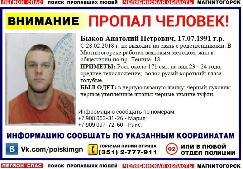В день исчезновения он был в черной вязаной шапке, черном пуховике, черных утепленных штанах и черных зимних туфлях.