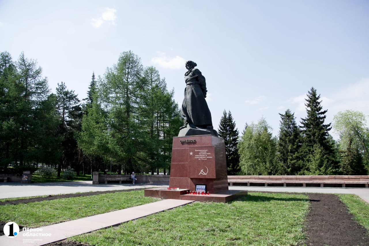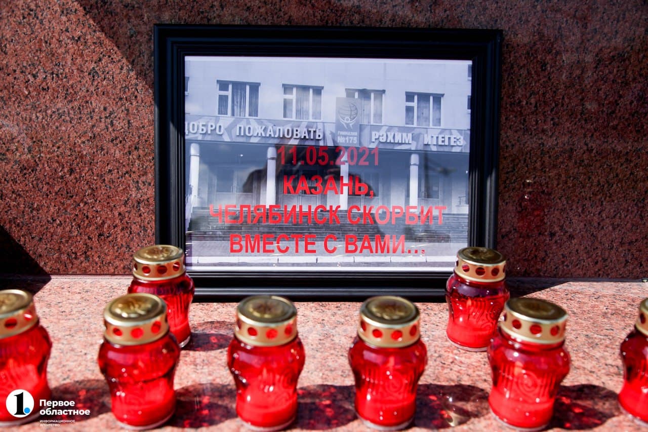 У памятника Орленку в Челябинске горожане возлагают цветы и зажигают свечи. В траурную рамку поместили фото школы с подписью: «11.05.2021. Казань, Челябинск скорбит вместе с вами».