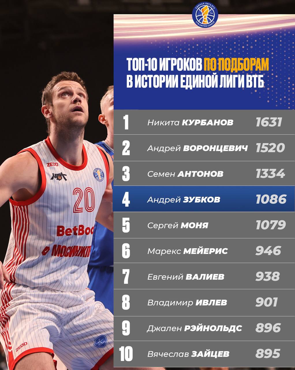 Форвард баскетбольного клуба «МБА-МАИ» Андрей Зубков покорил очередной рубеж в Единой лиге ВТБ. Челябинский игрок, совершив 10 подборов, поднялся на четвертое место по этому показателю в истории проведения этого турнира. Теперь на его счету 1086 подборов, сообщает официальный сайт Единой лиги ВТБ.