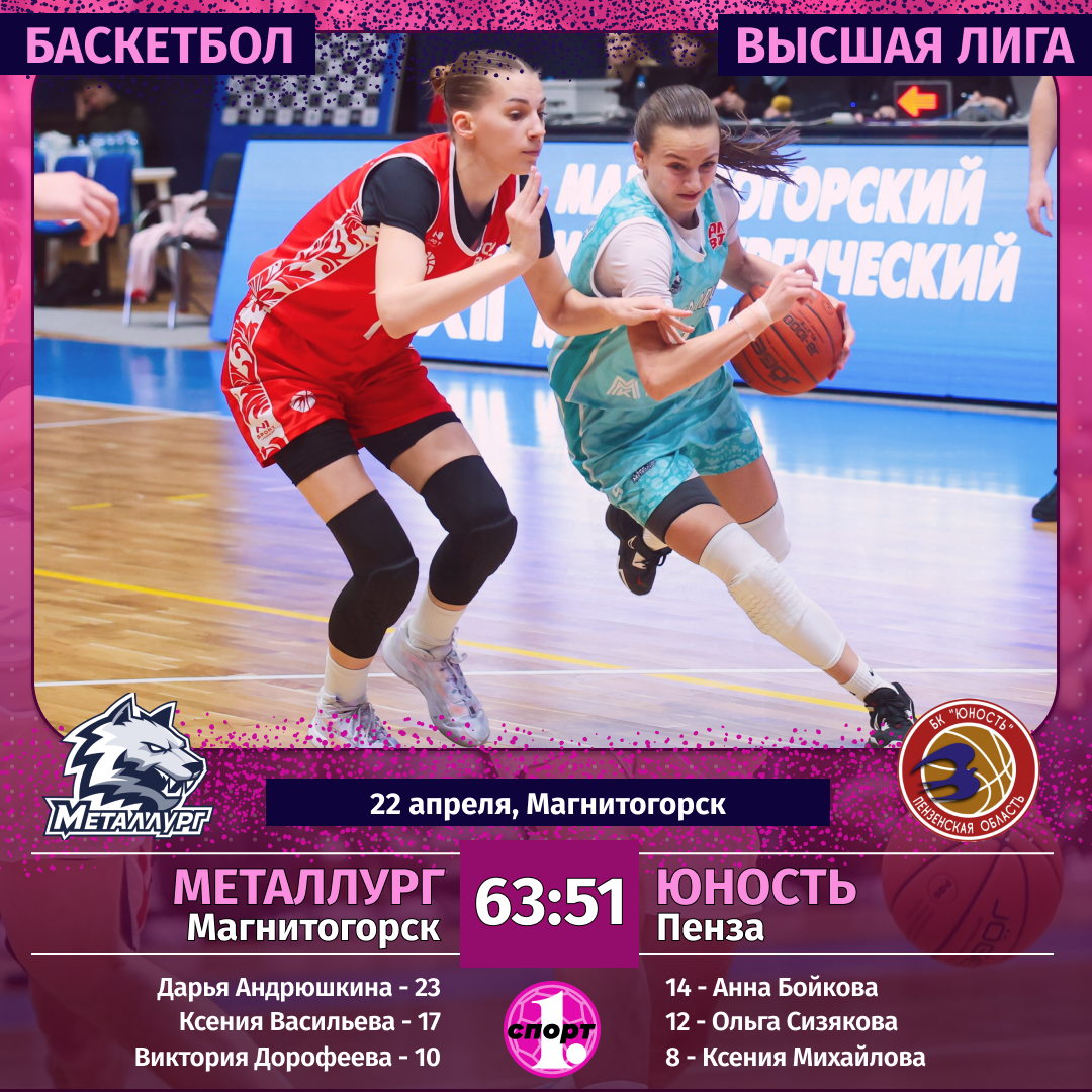 Баскетбол. Сезон-2025/2026. Высшая лига. Женщины. «Финал четырех». Полуфинал. 22 апреля. «Металлург» (Магнитогорск) — «Юность» (Пенза) — 63:51 (15:16, 13:15, 17:8, 18:12).