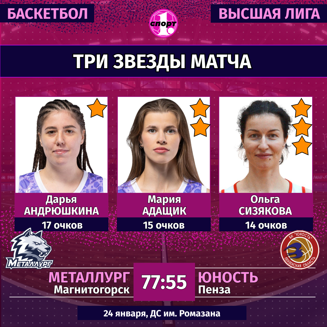 Баскетбол. Сезон-2025/2026. Высшая лига. Женщины. 24 января. «Металлург» (Магнитогорск) — «Юность» (Пенза) — 77:55 (21:14, 21:13, 16:15, 19:13).