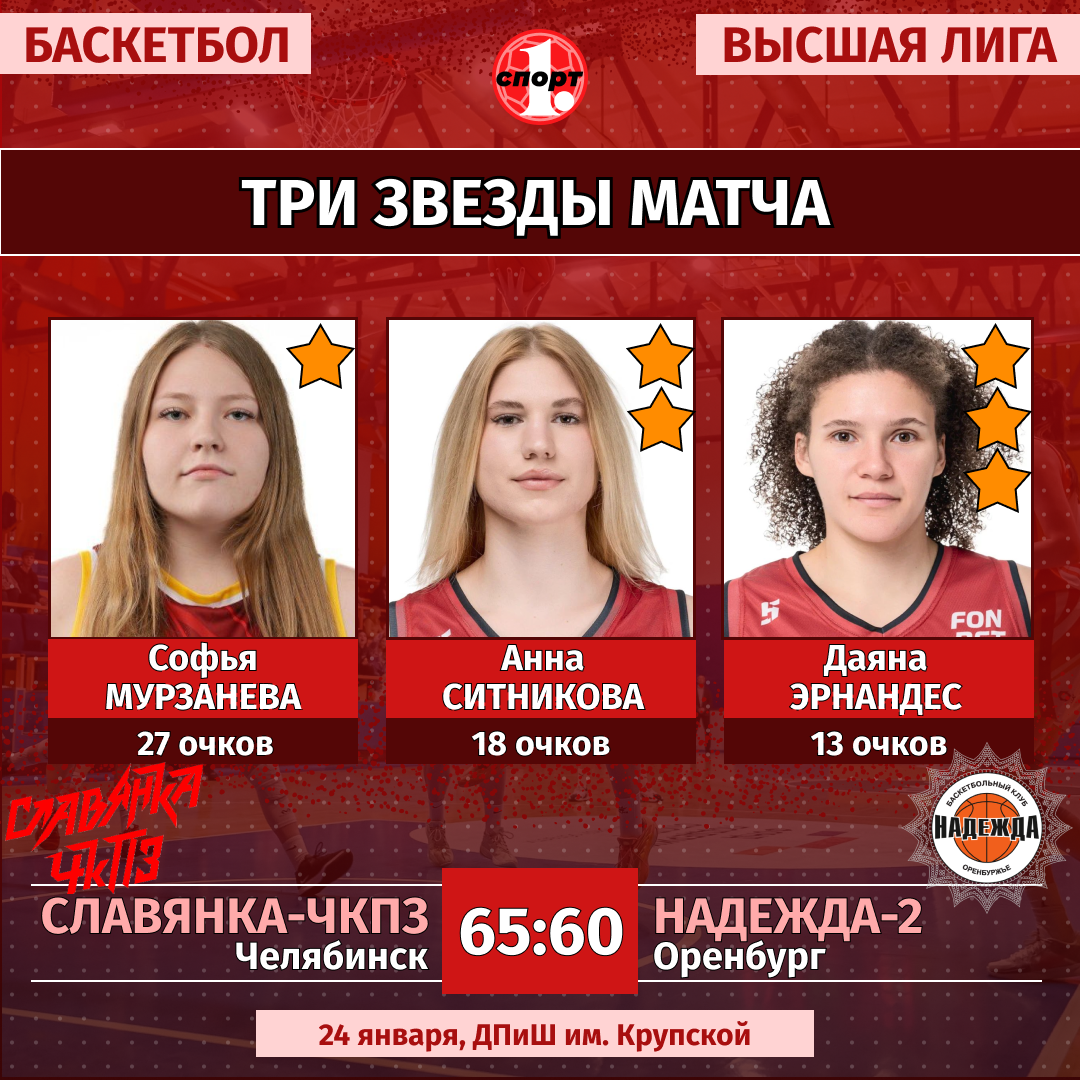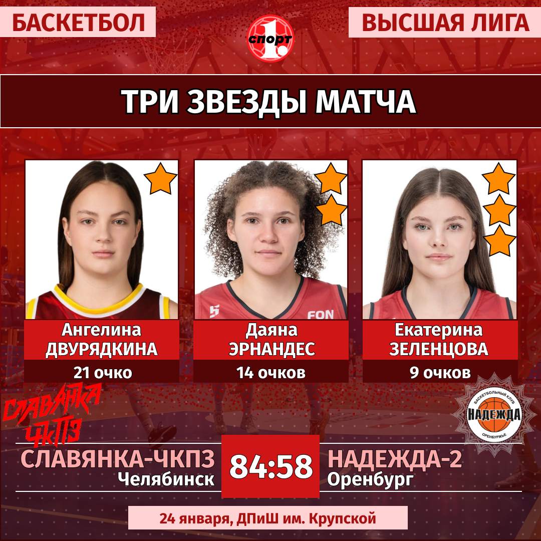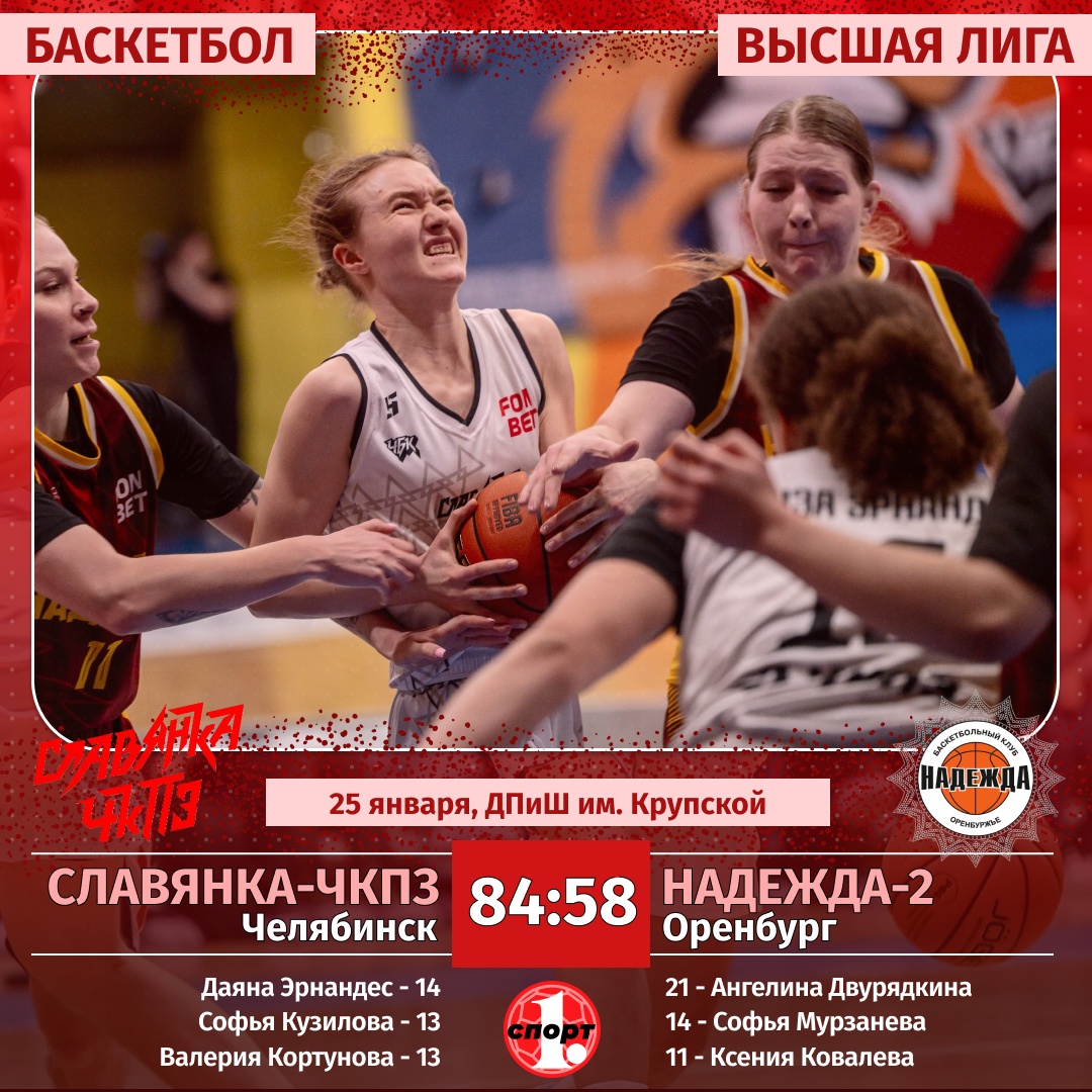 Баскетбол. Сезон-2025/2026. Высшая лига. Женщины. 25 января. «Славянка-ЧКПЗ» (Челябинск) — «Надежда-2» (Оренбург) — 84:58 (16:12, 16:14, 35:20, 17:12).