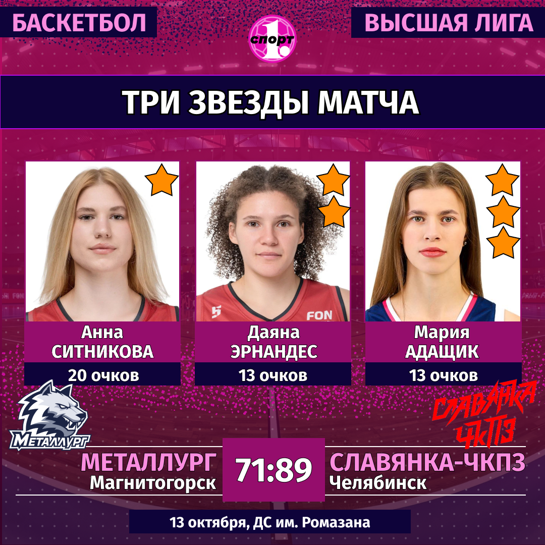 Вторая серия южноуральского баскетбольного дерби осталась за челябинской «Славянкой-ЧКПЗ». Сегодня, 13 октября, подопечные Евгения Рыжкова взяли реванш у магнитогорского «Металлурга» и одержали первую победу сезона в Высшей лиге — 89:71. У челябинок великолепный матч провела капитан команды Анна Ситникова: 19 очков и 11 подборов за 30 минут игры, сообщает корреспондент ИА «Первое областное».
