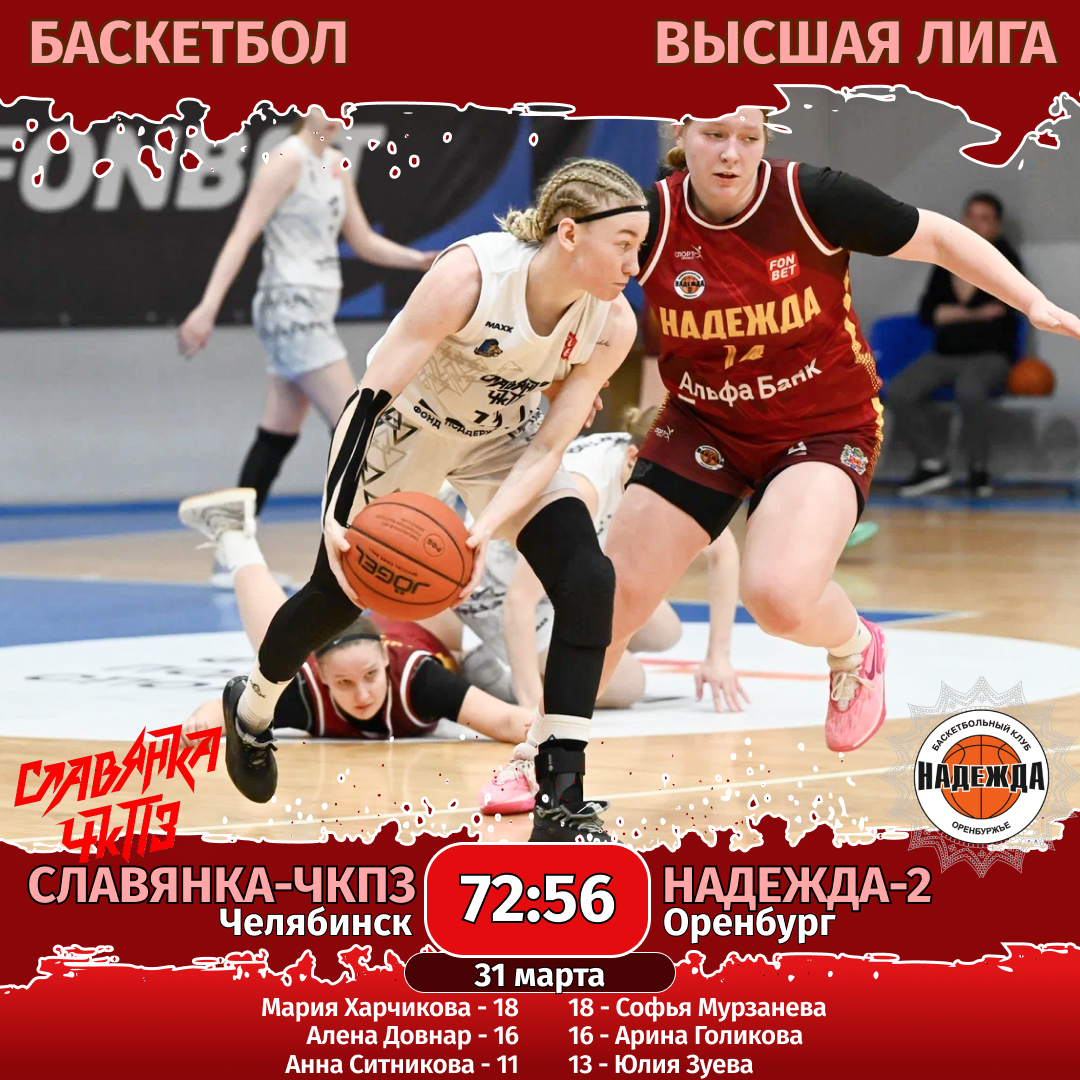 31 марта. «Славянка-ЧКПЗ» (Челябинск) — «Надежда-2» (Оренбург) — 72:56 (16:16, 20:6, 20:15, 16:19).