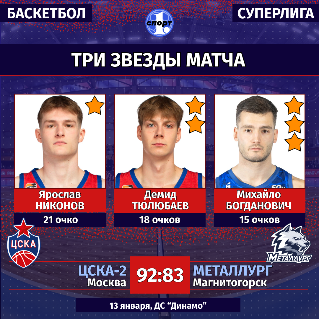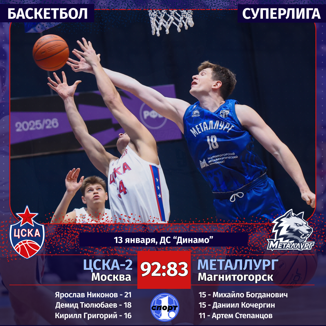 Баскетбол. Сезон-2025/2026. Суперлига. Мужчины. 13 января. ЦСКА-2 (Москва) — «Металлург» (Магнитогорск) — 92:83 (25:20, 19:19, 22:13, 26:31).