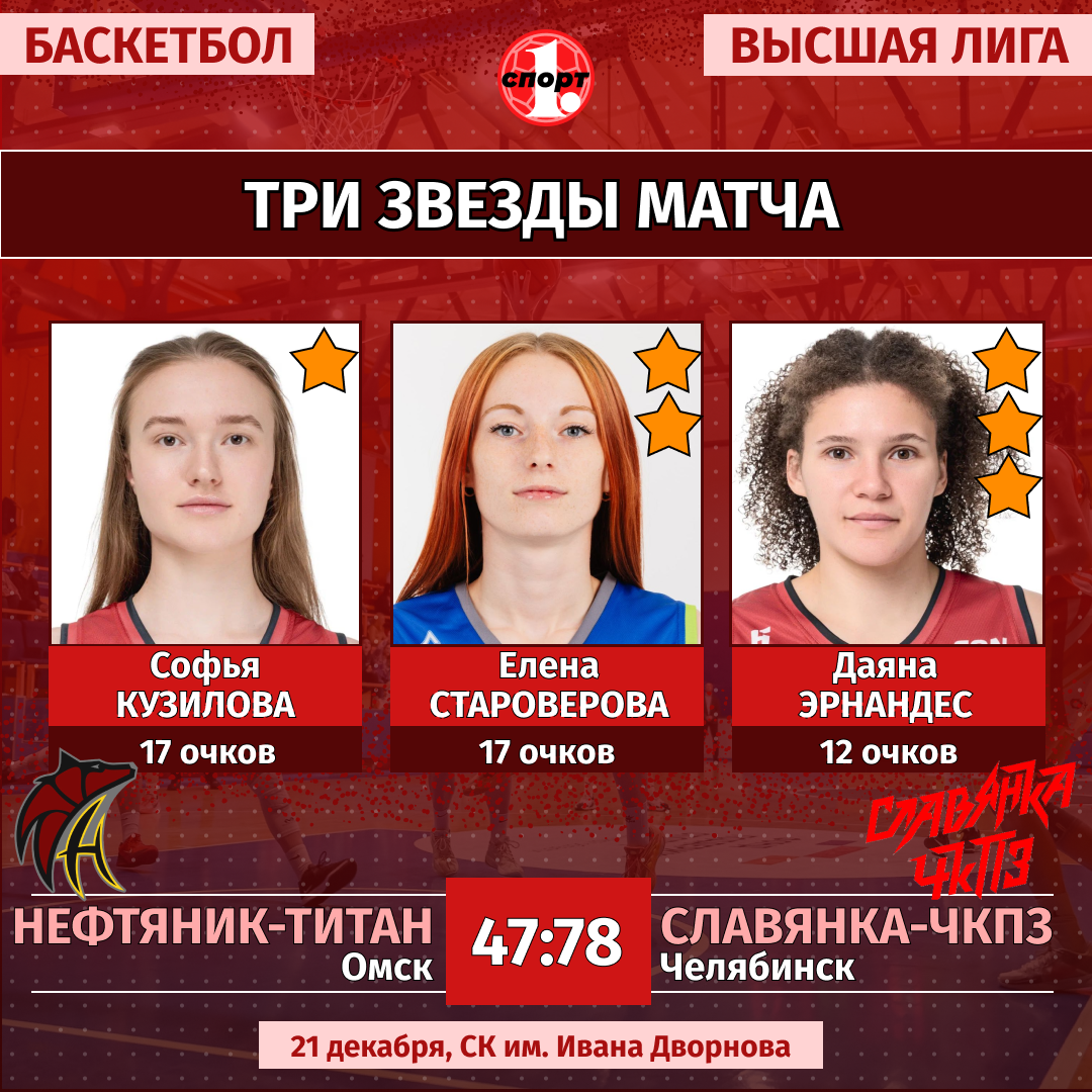 Баскетбол. Сезон-2025/2026. Высшая лига. Женщины. 21 декабря. «Нефтяник-Титан-2» (Омск) — «Славянка-ЧКПЗ» (Челябинск) — 47:78 (16:31, 11:18, 13:13, 7:16).