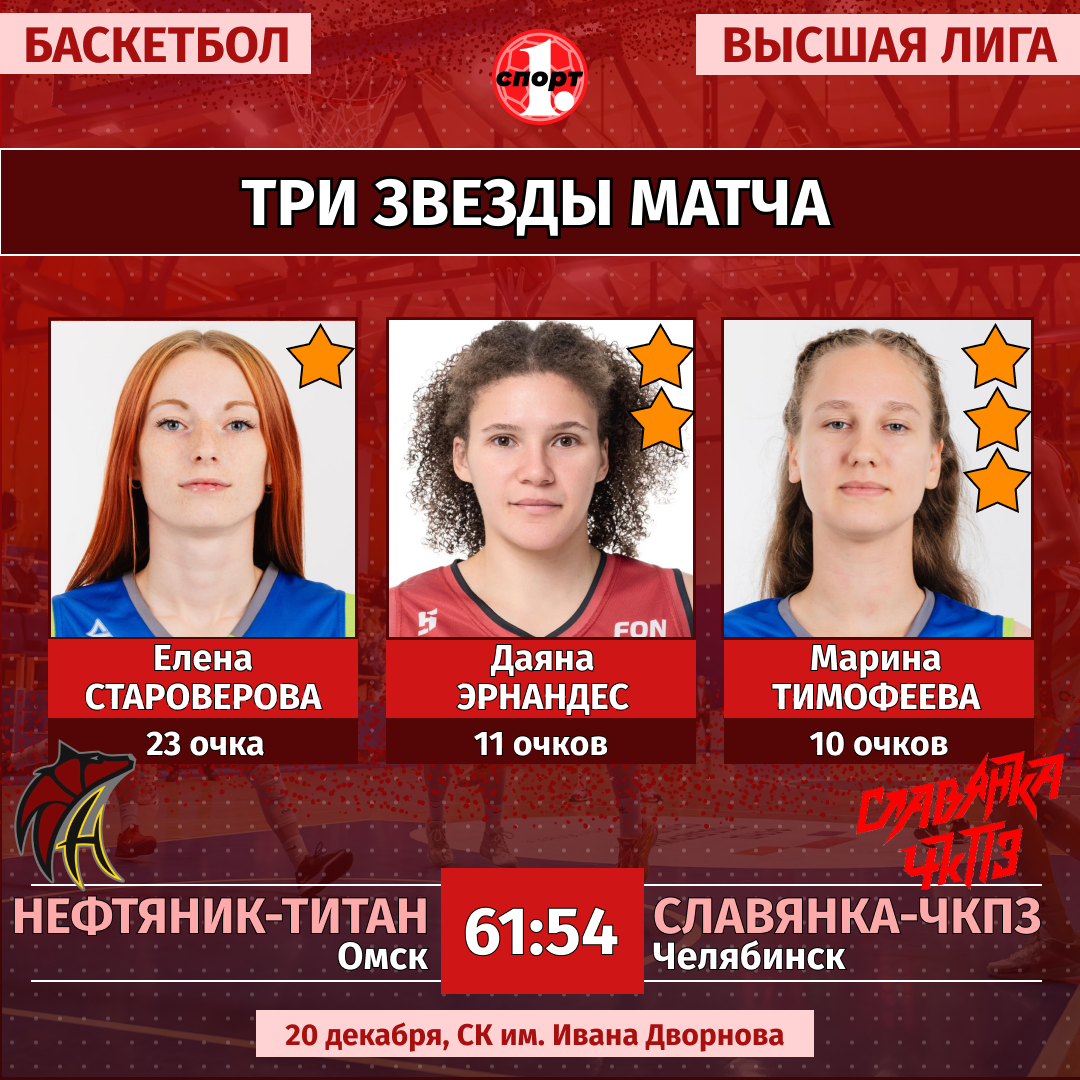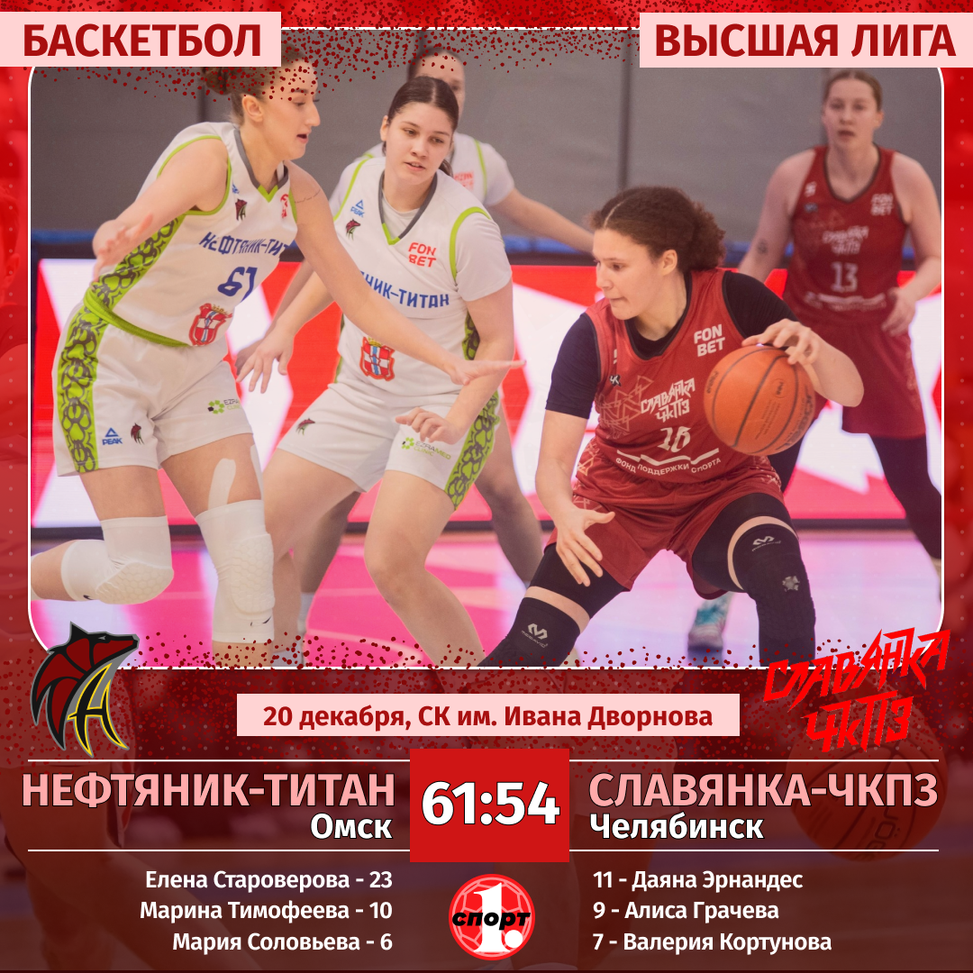 Баскетбол. Сезон-2025/2026. Высшая лига. Женщины. 20 декабря. «Нефтяник-Титан-2» (Омск) — «Славянка-ЧКПЗ» (Челябинск) — 61:54 (10:13, 17:18, 21:11, 13:12).