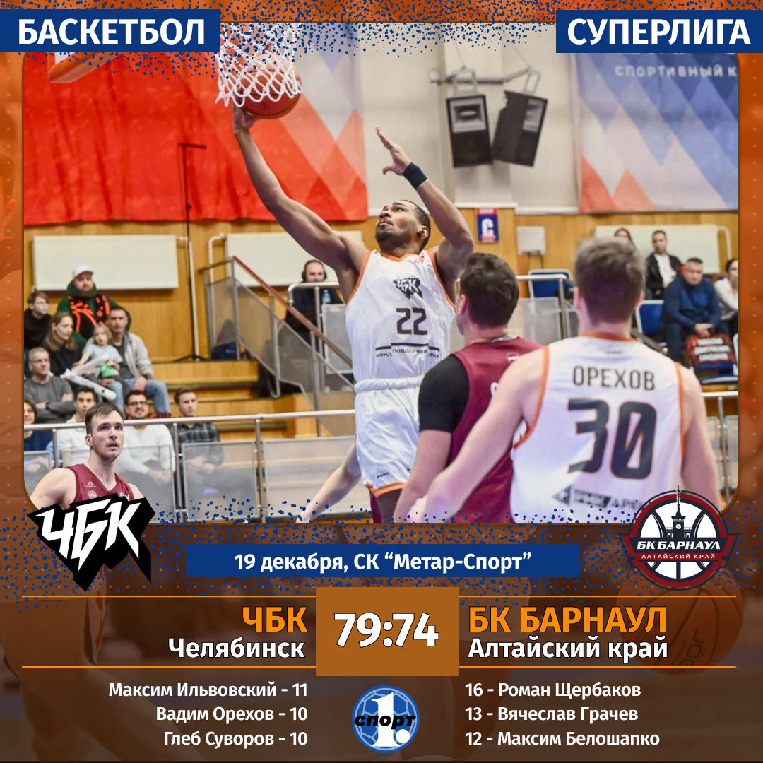 Баскетбол. Сезон-2025/2026. Суперлига. Мужчины. 19 декабря. «ЧБК» (Челябинск) — БК «Барнаул» (Алтайский край) — 79:74 (30:15, 16:16, 19:20, 14:23).