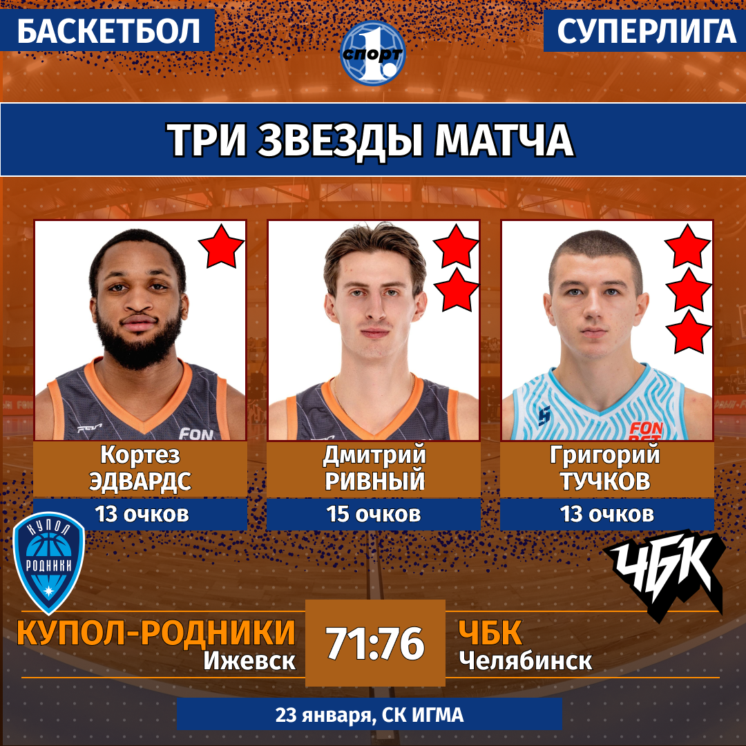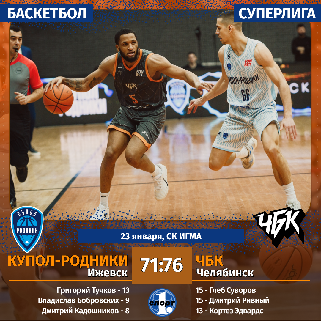 Баскетбол. Сезон-2025/2026. Суперлига. Мужчины. 23 января. «Купол-Родники» (Ижевск) — «ЧБК» (Челябинск) — 71:76 (17:22, 15:17, 23:20, 16:17).