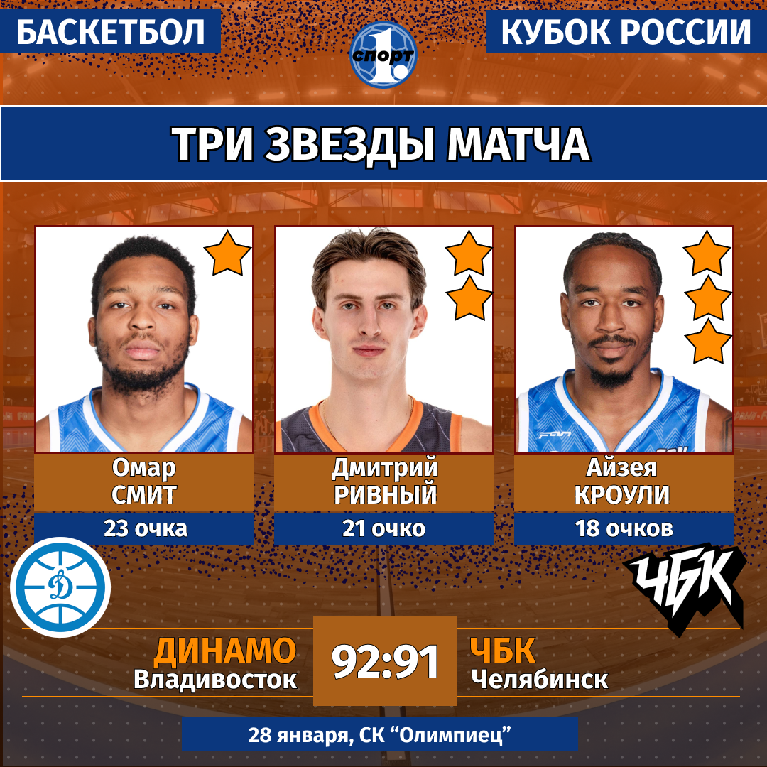 Баскетбол. Сезон-2025/2026. Кубок России. Мужчины. Четвертьфинал. Ответный матч. 28 января. «Динамо» (Владивосток) — «ЧБК» (Челябинск) — 92:91 (22:28, 22:24, 29:17, 19:22).