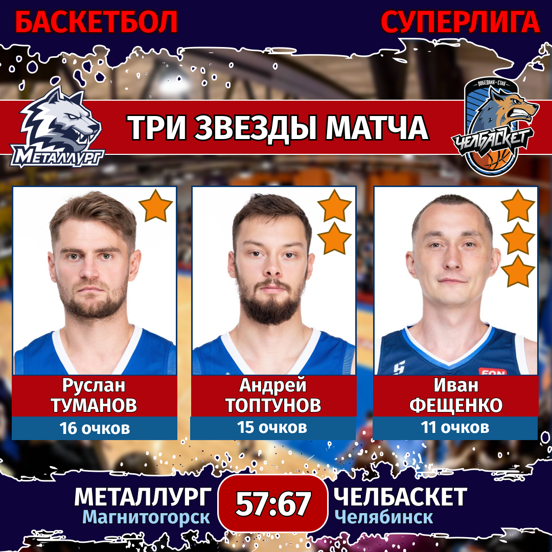 «Челбаскет»: Туманов (16), Топтунов (15), Лавников (10), Эрнандес-Зиненко (7), Подобедов (7), Нелюбов (6), Стубеда (5), Незванкин (1), Печенджиян, Якунин, Третьяк.