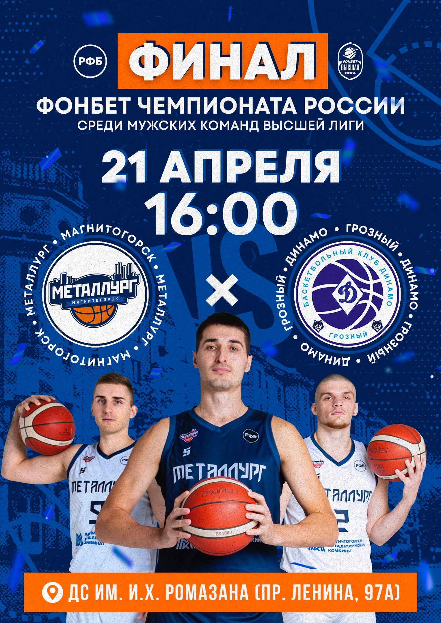 Решающий матч баскетбольного сезона в Высшей лиге чемпионата России состоится 21 апреля в Магнитогорске. Команда «Металлург» во Дворце спорта им. И. Х. Ромазана принимает грозненское «Динамо». Победитель этого матча завоюет титул чемпиона, а также получит право выступить в следующем сезоне в Суперлиге, сообщает корреспондент ИА «Первое областное».