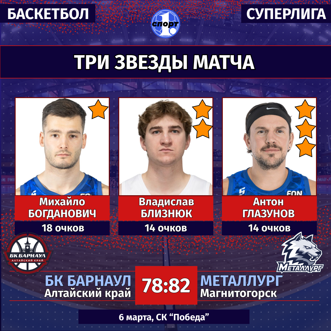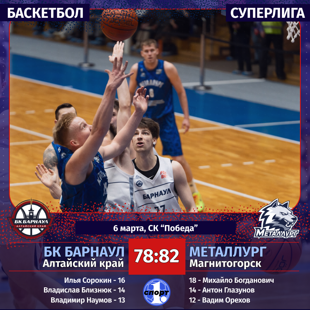 Баскетбол. Сезон-2025/2026. Суперлига. Мужчины. 6 марта. БК «Барнаул» (Алтайский край) — «Металлург» (Магнитогорск) — 78:82 (25:18, 22:20, 13:16, 18:28).