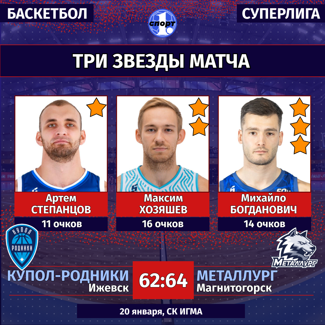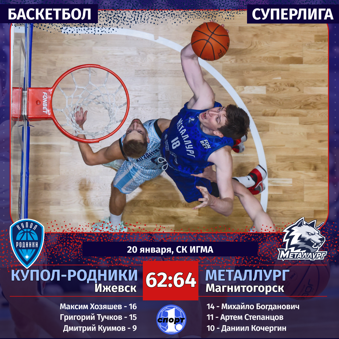 Баскетбол. Сезон-2025/2026. Суперлига. Мужчины. 20 января. «Купол-Родники» (Ижевск) — «Металлург» (Магнитогорск) — 62:64 (15:18, 22:12, 15:20, 10:14).