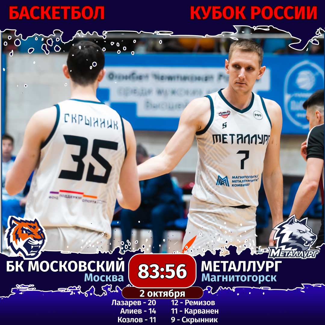 Баскетбол. Кубок России. 1/32 финала. 2 октября. БК «Московский» (Москва) — «Металлург» (Магнитогорск) — 83:56 (19:13, 27:19, 19:8).