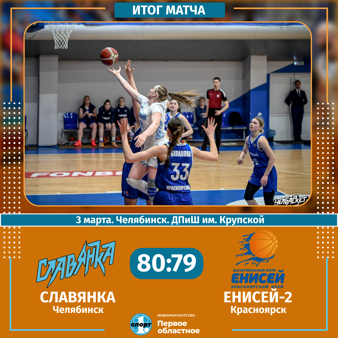 Баскетболистки челябинского клуба «Славянка» взяли реванш у «Енисея-2» в Высшей лиге чемпионата России. Сегодня, 3 марта, наша команда выиграла у соперниц из Красноярска со счетом 80:79. Героем матча стала Карина Переменина, в активе которой 30 очков и 17 подборов, сообщает корреспондент ИА «Первое областное».