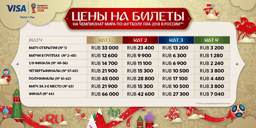 Также организаторы назвали стоимость посещения всех матчей для резидентов России и гостей. Для россиян доступны самые дешевые билеты цены, здесь уровень цен начинается от 1 280 рублей на матчи группового этапа. Для всех остальных болельщиков, а также желающих увидеть матчи с более удобных трибун, представлены 3 категории билетов. Самые дорогие билеты — на финальную игру, их стоимость сопоставима с презентованной накануне новинкой от Apple.