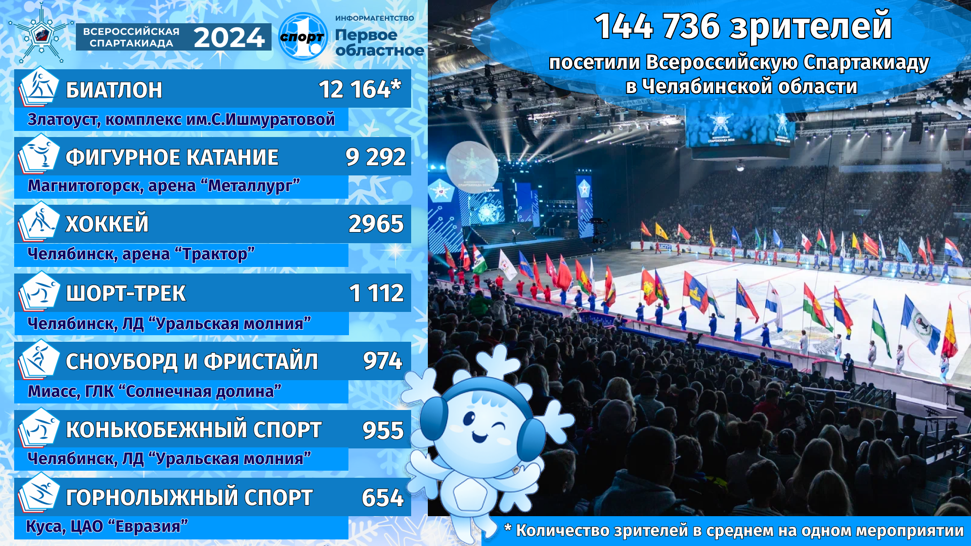 В общей сложности состязания Всероссийской зимней спартакиады в Челябинской области посетили 144 736 зрителей. Такие данные обнародовал оргкомитет соревнований, основываясь на количестве приобретенных билетов. Конечно, нужно учитывать, что эта цифра примерная и погрешность имеет место быть. Скажем, не все болельщики, купившие билеты, пришли на соревнования. Но немало и тех любителей спорта, которые пришли на спортплощадки по приглашениям, аккредитациям и так далее.