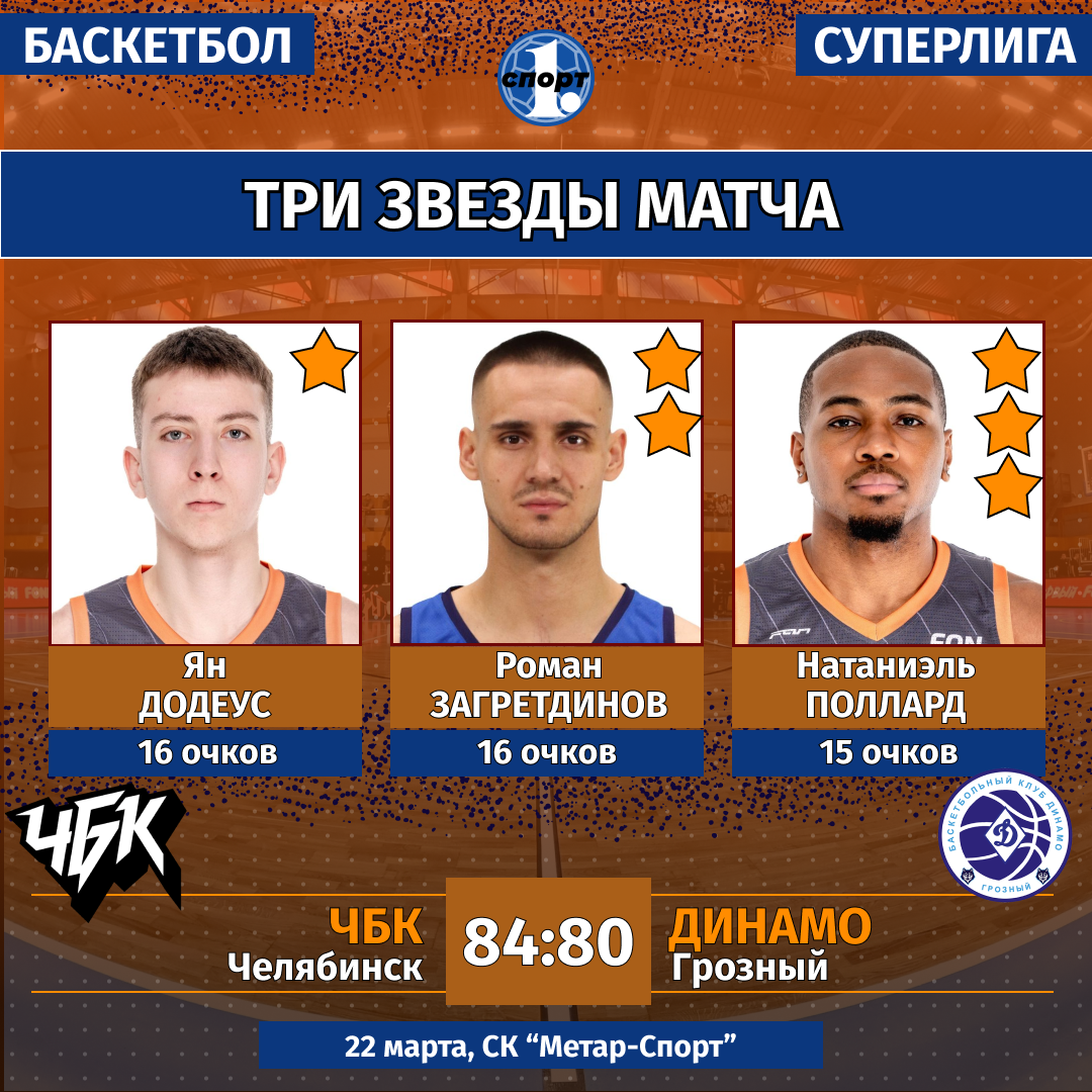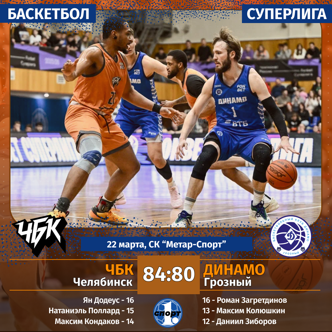 Баскетбол. Сезон-2025/2026. Суперлига. Мужчины. 22 марта. «ЧБК» (Челябинск) — «Динамо» (Грозный) — 84:80 (22:27, 19:10, 16:21, 27:22).