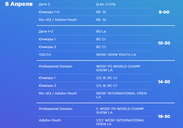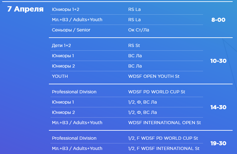 Соревнования начнутся с 8 утра. Перед судьями выступят дети, юниоры и взрослые, а также молодежь. Они будут выступать группами, а затем среди всех пар и сольных танцоров определят победителя. Завершится танцевальный уикенд 8 апреля Чемпионатом мира в латиноамериканской программе.