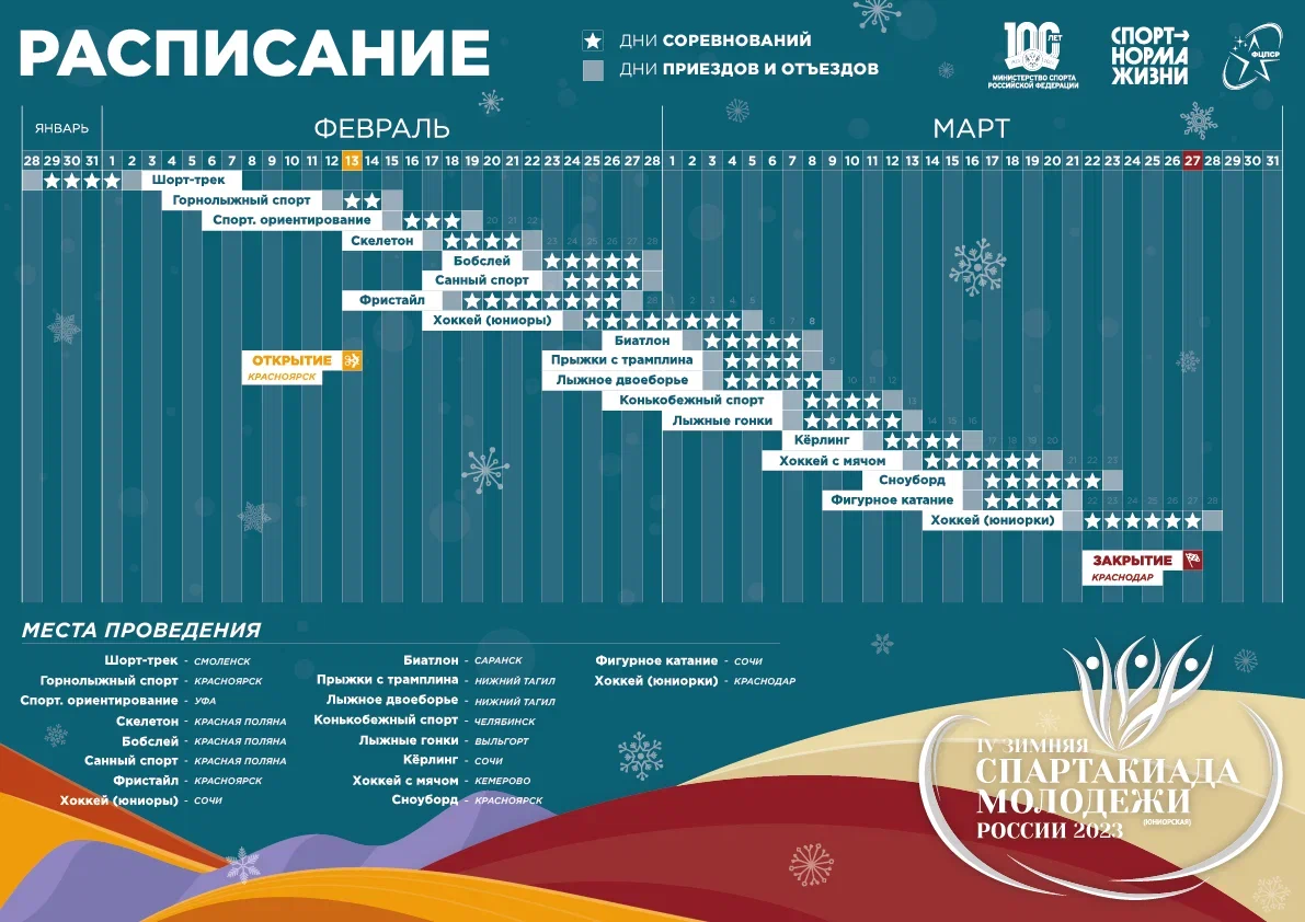 Финальные старты IV зимней Спартакиады молодежи России проходили с 28 января на территории девяти субъектов РФ. Торжественная церемония открытия состоялась 13 февраля в Красноярске, а торжественная церемония закрытия — 27 марта в Краснодаре.