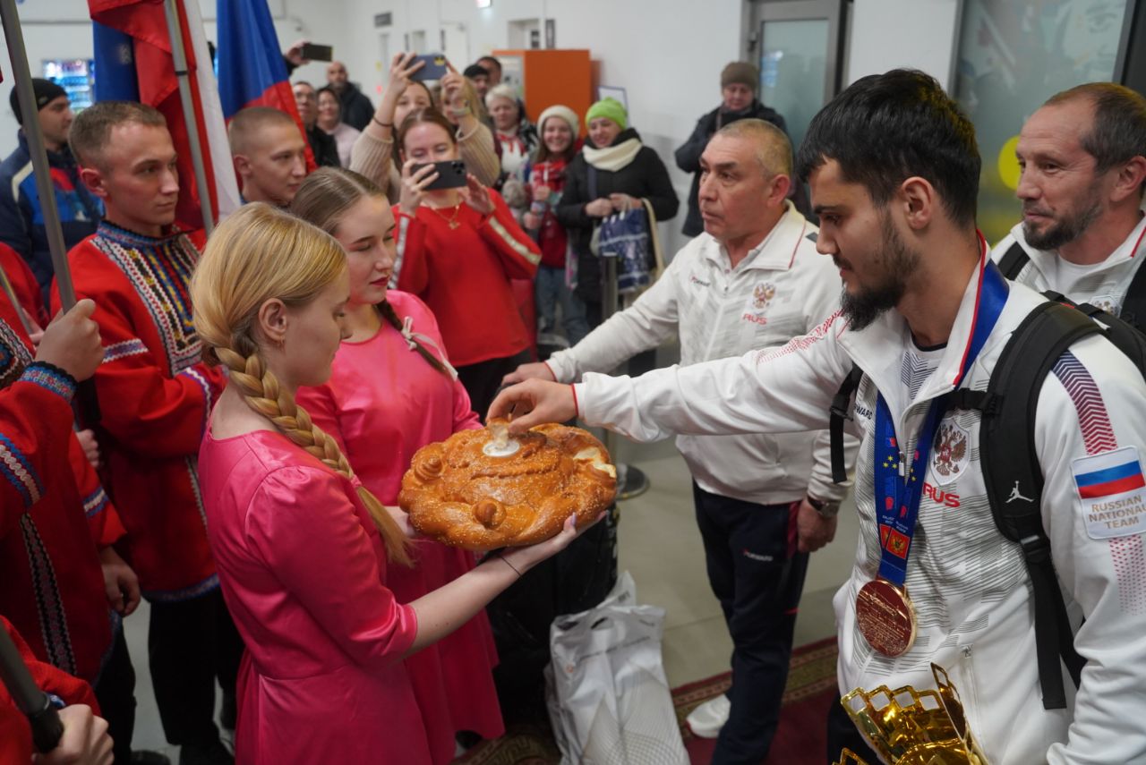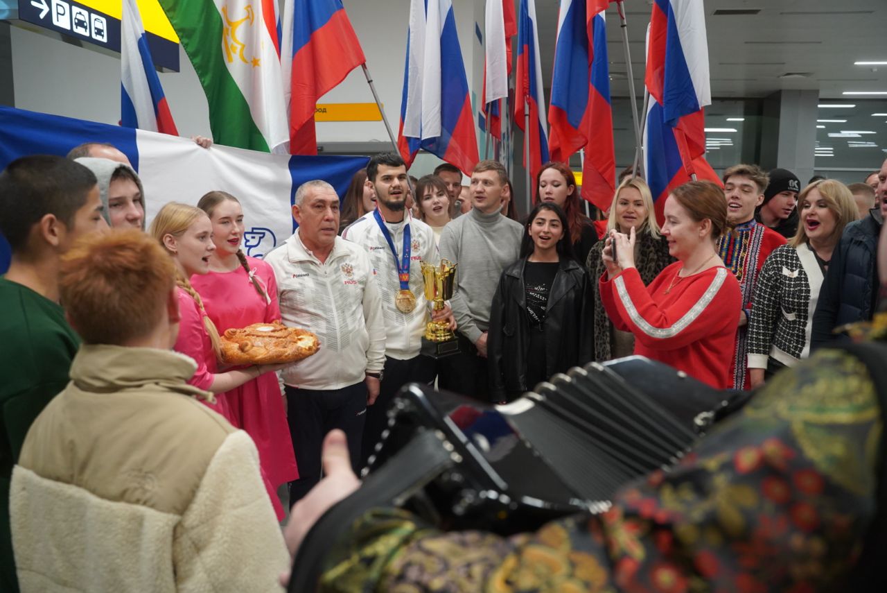 Триумфатора чемпионата Европы встречала дружная и большая делегация. Прибыли поздравить спортсмена руководители регионального Минспорта и областной федерации бокса, тренеры и друзья-коллеги, волонтеры из УралГУФК и ЮУрГУ, а также представители таджикской диаспоры — родины боксера. Встреча прошла тепло и празднично, в ней сочетались элементы русской культуры и культуры Таджикистана. Участники встречи исполнили гимн Российской Федерации.