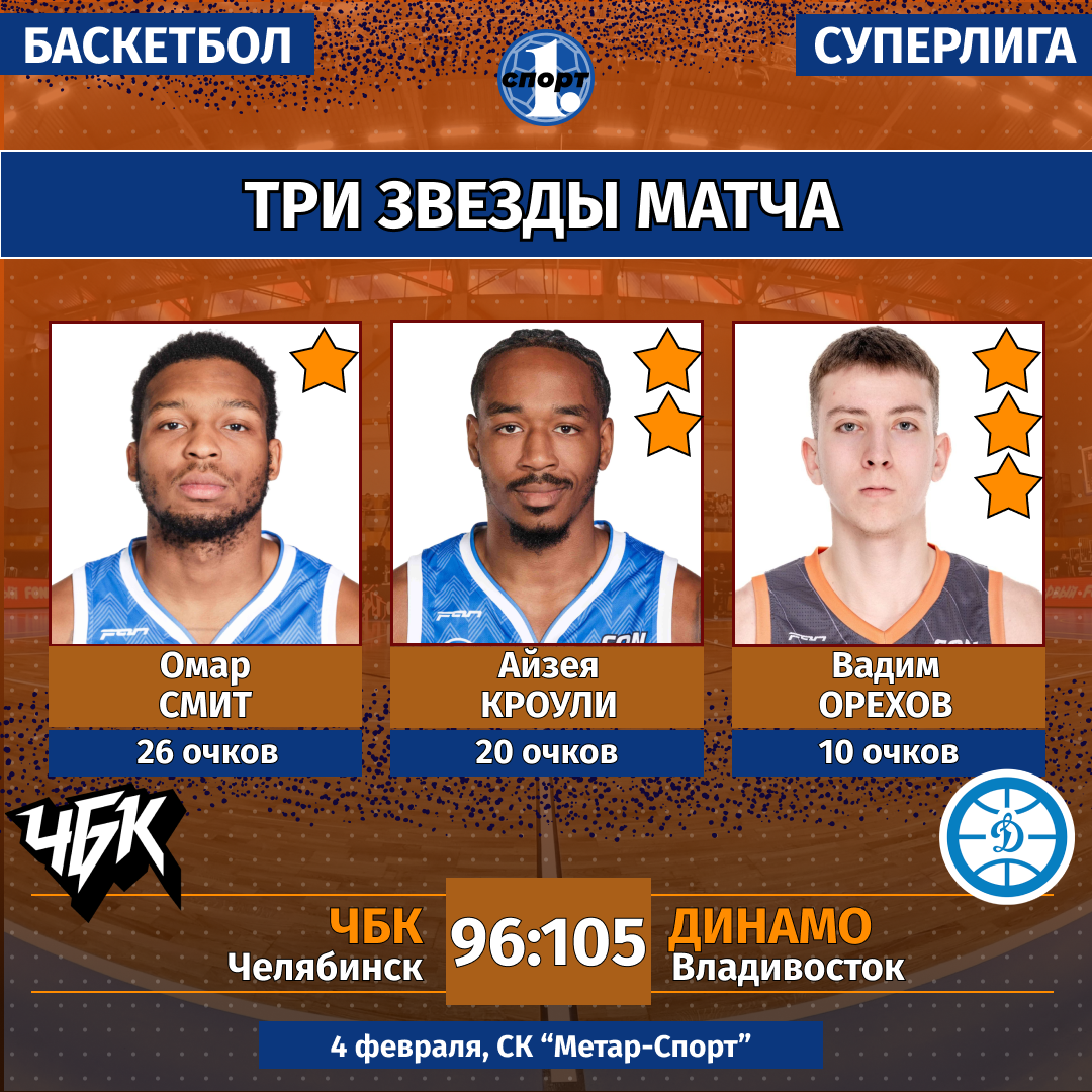 Баскетбол. Сезон-2025/2026. Суперлига. Мужчины. 4 февраля. «ЧБК» (Челябинск) — «Динамо» (Владивосток) — 96:105 (26:34, 29:28, 24:21,17:22).