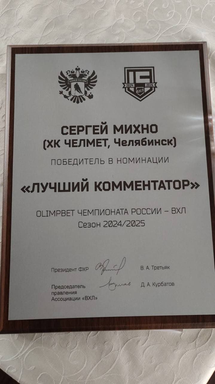 «Железный комментатор, который держал всех зрителей в напряжении целых 158 минут и 5 секунд, получил свою заслуженную награду», — так отреагировала на новость пресс-служба ХК «Челмет».