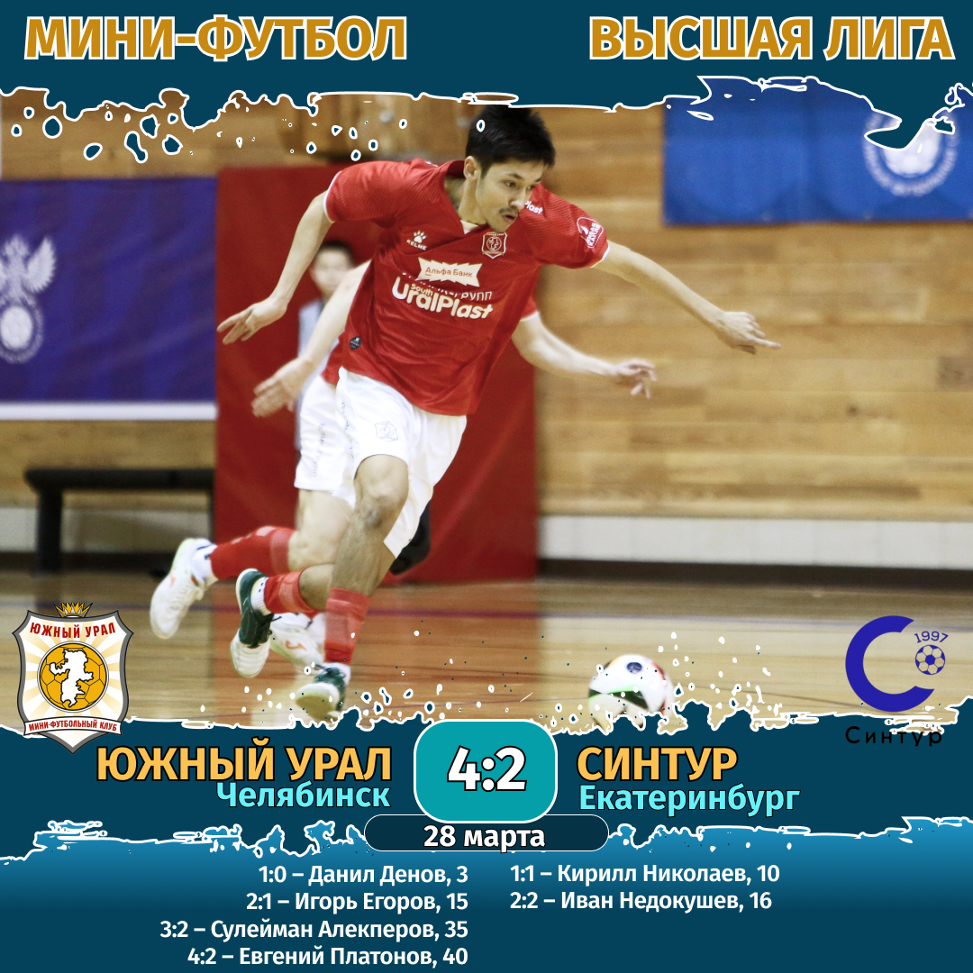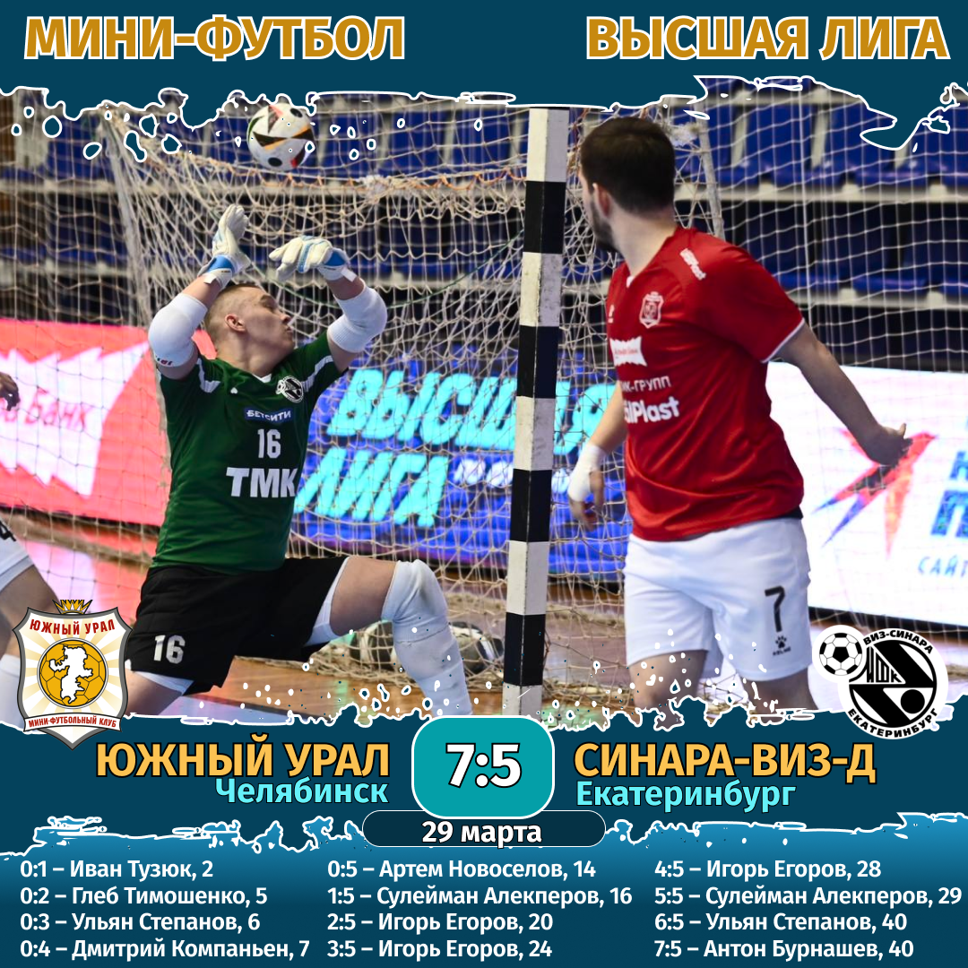 На следующий день, 29 марта, МФК «Южный Урал» сыграл еще один матч с соперниками из Екатеринбурга. На сей раз с клубом «Синара-ВИЗ-Д». Эта игра стала украшением всего чемпионата Высшей лиги. Гости здорово начали поединок, забили к 14-й минуте аж 5 безответных голов! Казалось, все… На этом можно ставить точку.