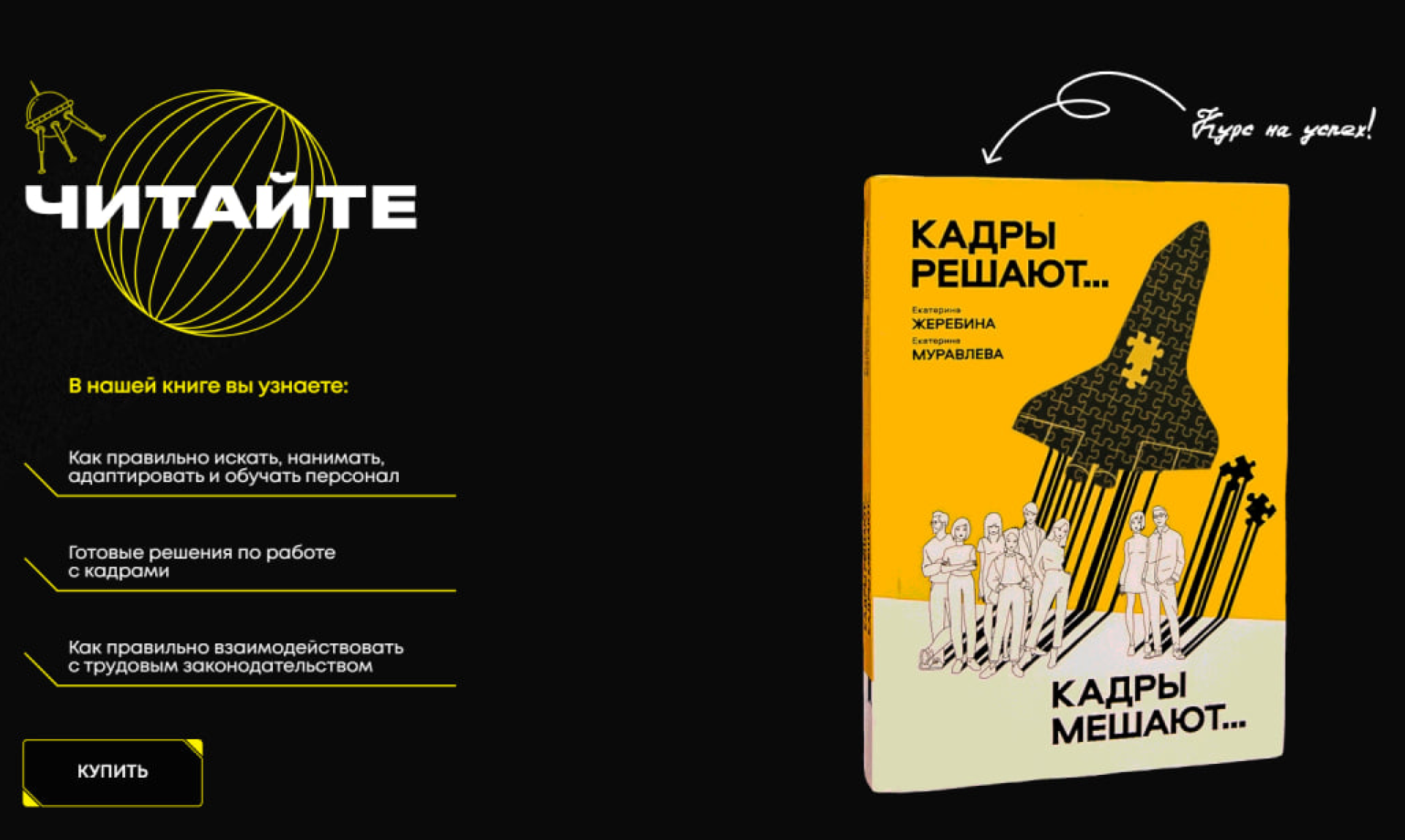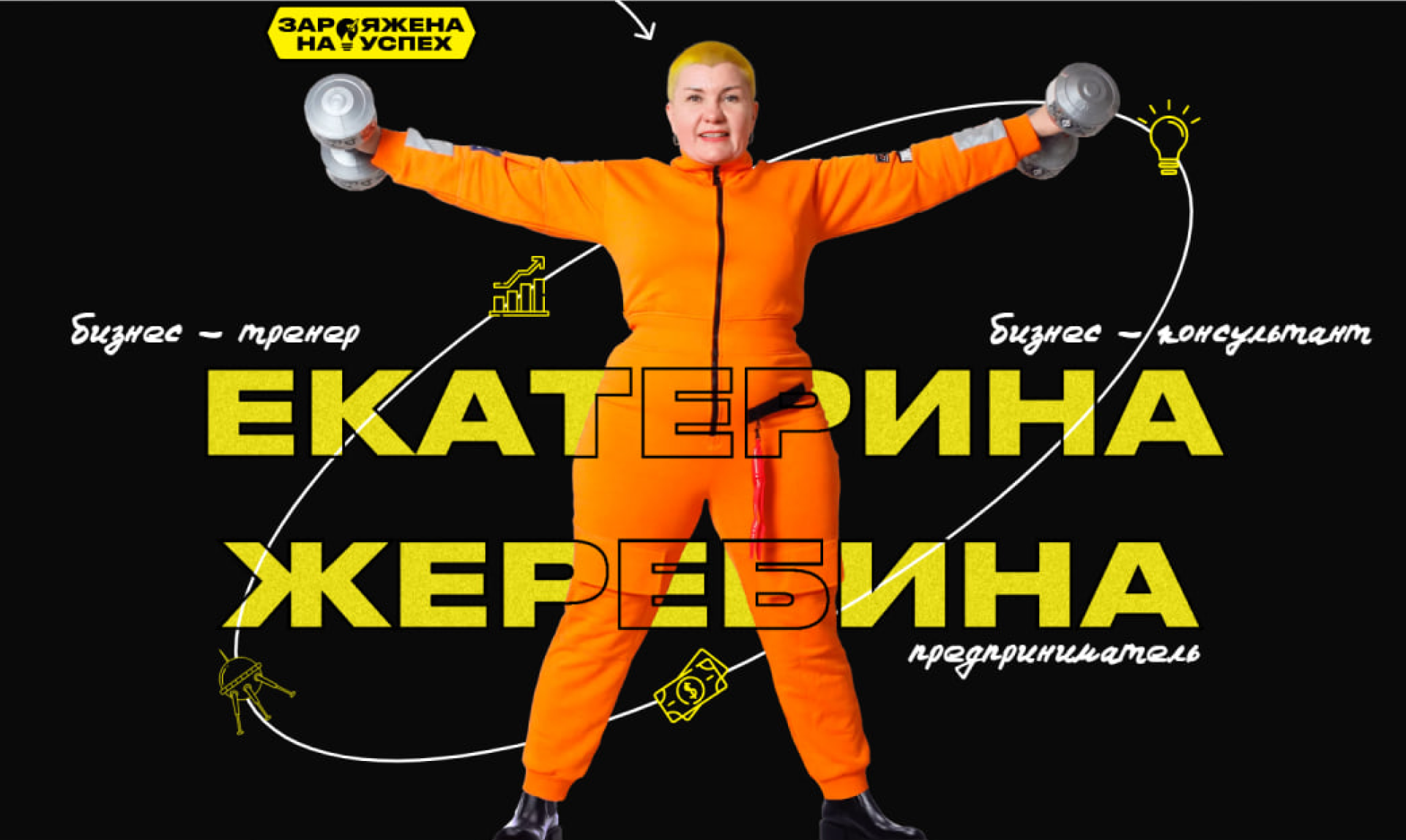«Капитан Жеребина — конструктор космических кораблей в сфере бизнеса», — гласит одна из надписей. Кликаешь на нее — и «проваливаешься» на страницу с биографией этой необычной женщины. На главной странице сайта фотография Екатерины в теперь уже хорошо знакомом оранжевом костюме, а рядом слоган: «Заряжена на успех». Как все символично…