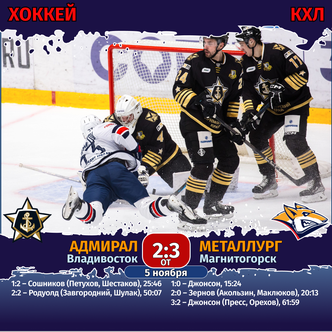 Хоккей. Чемпионат КХЛ. «Адмирал» (Владивосток) — «Металлург» (Магнитогорск) — 2:3 (0:1, 1:1, 1:0, 0:1).