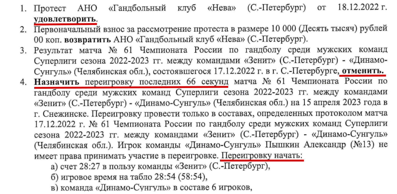 То есть вы понимаете все абсурдность ситуации? В пылу борьбы на последних минутах матча при равном счете у одной команды на площадке оказывается один лишний игрок. Судьи этого не замечают. Звучит финальный свисток, ничья. Питерский клуб подает протест, судейский комитет с удивлением обнаруживает, что «проморгал» нарушение, признает свою вину. А пять дней спустя другая инстанция утверждает, что матч нужно переиграть. Ничего подобного в практике проведения гандбольных матчей, да и в любых других командных видах спорта, кажется, не было (если есть такие примеры — будем рады вас услышать).