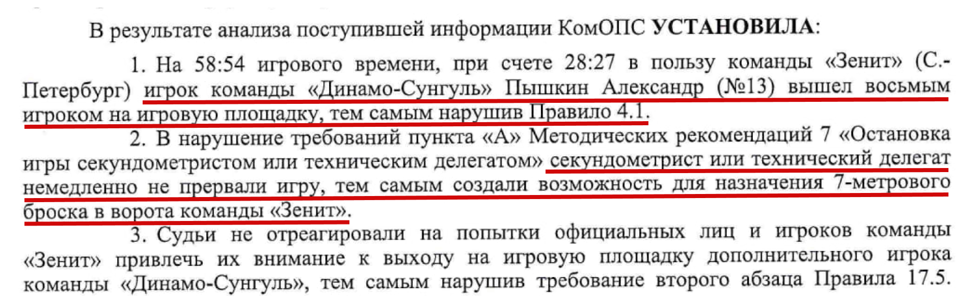 В распоряжении редакции Первого областного информагентства есть документ решения КомОПС по дисциплинарному делу матча «Зенит» (Санкт-Петербург) vs «Динамо-Сунгуль» (Челябинская область). Предлагаем вашему вниманию скрины документа, красным выделили ключевые формулировки.