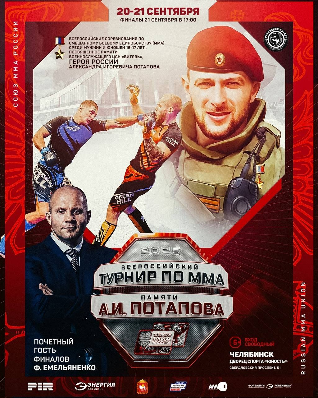В челябинском дворце спорта «Юность» проведут мастерский турнир по смешанному боевому единоборству ММА памяти Героя России Александра Потапова. Посетит состязания 20—21 сентября знаменитый Федор Емельяненко. Руководитель Союза ММА России оценит уровень подготовки южноуральских бойцов ММА, сообщают организаторы турнира.