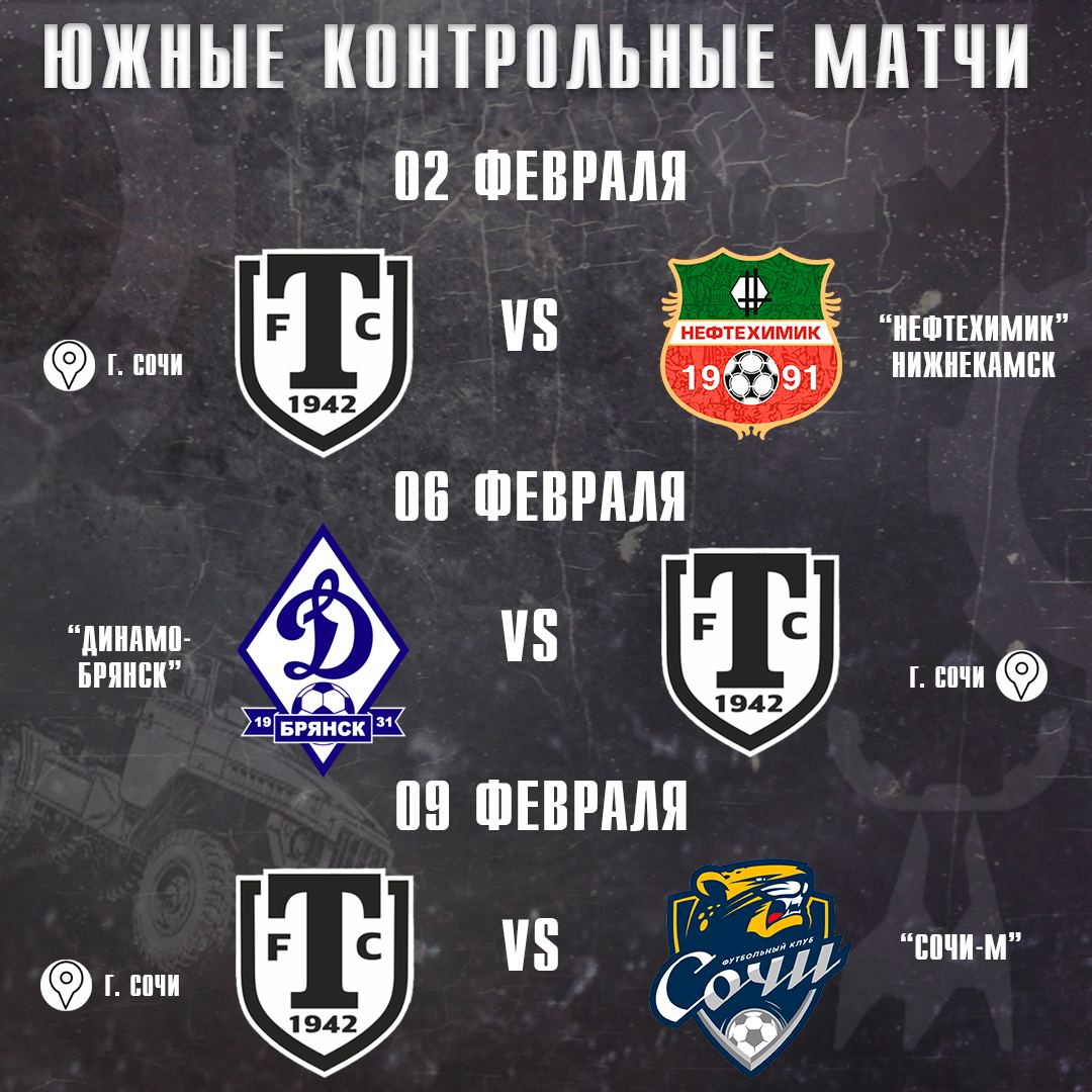 В Сочи миасское «Торпедо» проведет пять контрольных матчей, в первом из которых сыграет 2 февраля с представителем Первой лиги чемпионата России нижнекамским «Нефтехимиком». Кроме того, 6 февраля южноуральцы проведут спарринг с соперником по группе «Серебро» Второй лиги А брянским «Динамо», а затем проэкзаменуют 9 февраля молодежный состав ФК «Сочи». Запланированы еще два контрольных матча с соперниками, о которых будет сообщено позже. Там же руководство клуба представит и первого новичка команды.