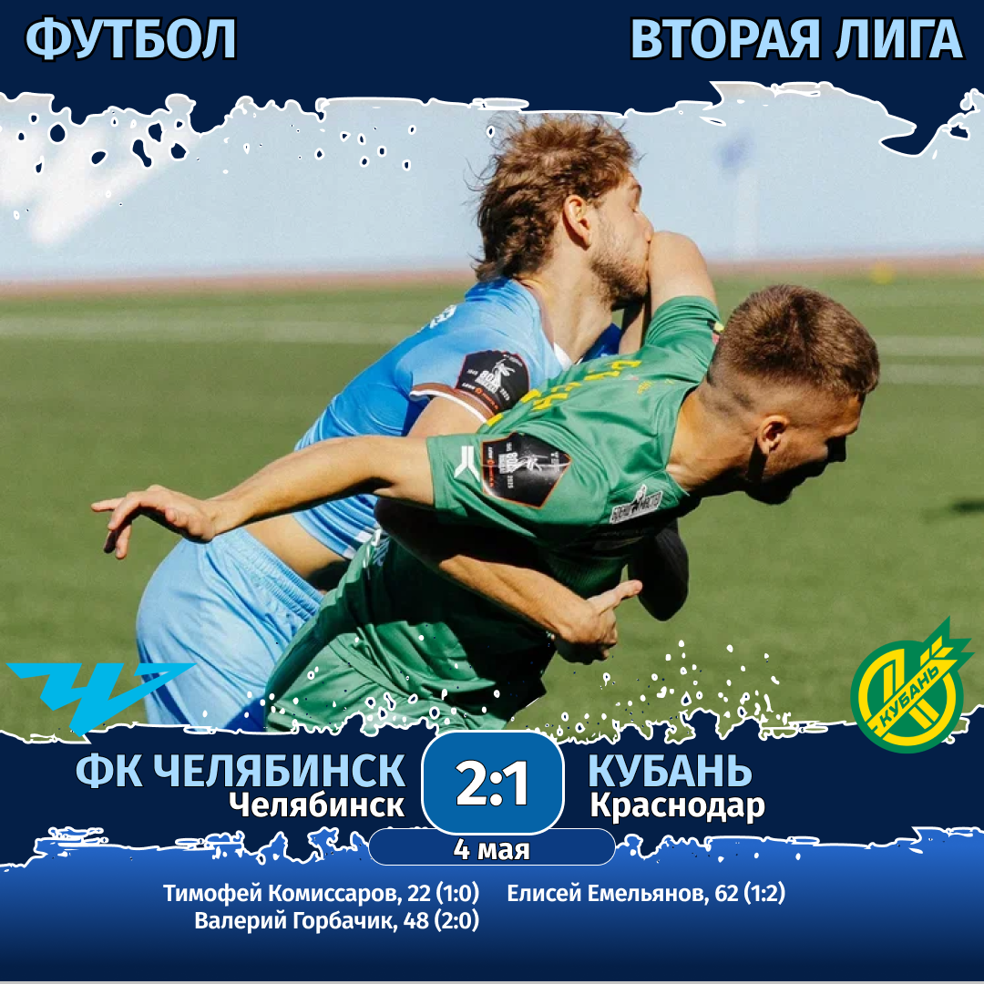 Важную победу во Второй лиге А одержал ФК «Челябинск». Подопечные Романа Пилипчука на своем поле выиграли у краснодарской «Кубани» со счетом 2:1. У хозяев отличились Тимофей Комиссаров и Валерий Горбачик. Гости ответили голом престижа во втором тайме. ФК «Челябинск» благодаря победе вплотную подобрался к группе лидеров группы «Золото», сообщает корреспондент ИА «Первое областное».