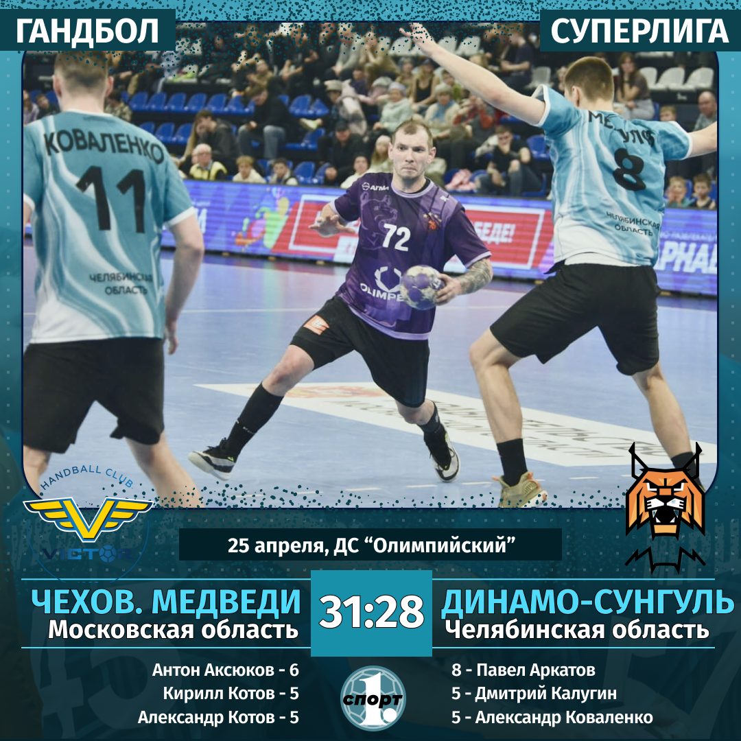 В гандбольной Суперлиге приятный сюрприз преподнес клуб «Динамо-Сунгуль», который едва не сотворил сенсацию в четвертьфинале плей-офф. Южноуральская команда по итогам двух матчей уступила один гол самому титулованному клубу страны — «Чеховским медведям». После домашней победы (28:26) «Динамо-Сунгуль» проиграл в гостях подмосковному клубу (28:31) и выбыл из борьбы за медали чемпионата, сообщает корреспондент ИА «Первое областное».