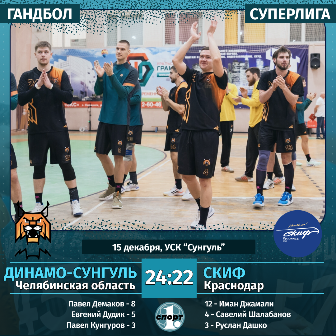 Гандбол. Сезон-2025/2026. Суперлига. Мужчины. 15 декабря. «Динамо-Сунгуль» (Челябинская область) — СКИФ (Краснодар) — 24:22 (11:10).