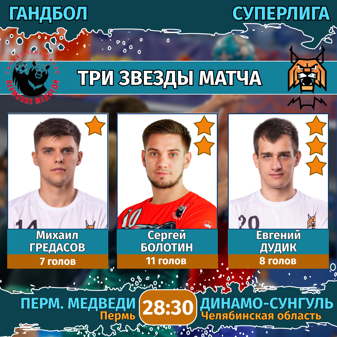 «Пермские медведи»: Сергей Болотин (11), Денис Афонин (4), Никита Каменев (3), Кирилл Воронин (3), Дмитрий Свистунов (2), Роман Калашников (2), Артем Пономарев (2), Иван Фирсов (2), Арсений Ухваркин (1), Илья Рябов, Ян Ковалев, Артем Сельвесюк; Андрей Дьяченко (12/26 — 46%), Станислав Юрча (5/19 — 26%).