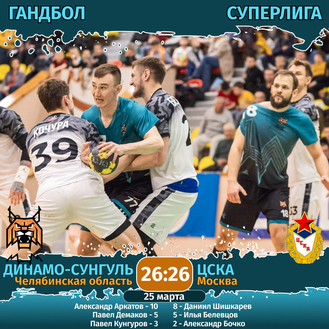 Завершил свое выступление в регулярном чемпионате Суперлиги гандбольный клуб «Динамо-Сунгуль». В последнем матче турнира южноуральцы сыграли вничью в домашнем поединке со столичным ЦСКА — 26:26. Теперь подопечным Дмитрия Карлова предстоит сыграть в серии плей-офф, их ближайший соперник определится 31 марта после того, как завершат «регулярку» все команды чемпионата, сообщает корреспондент ИА «Первое областное».