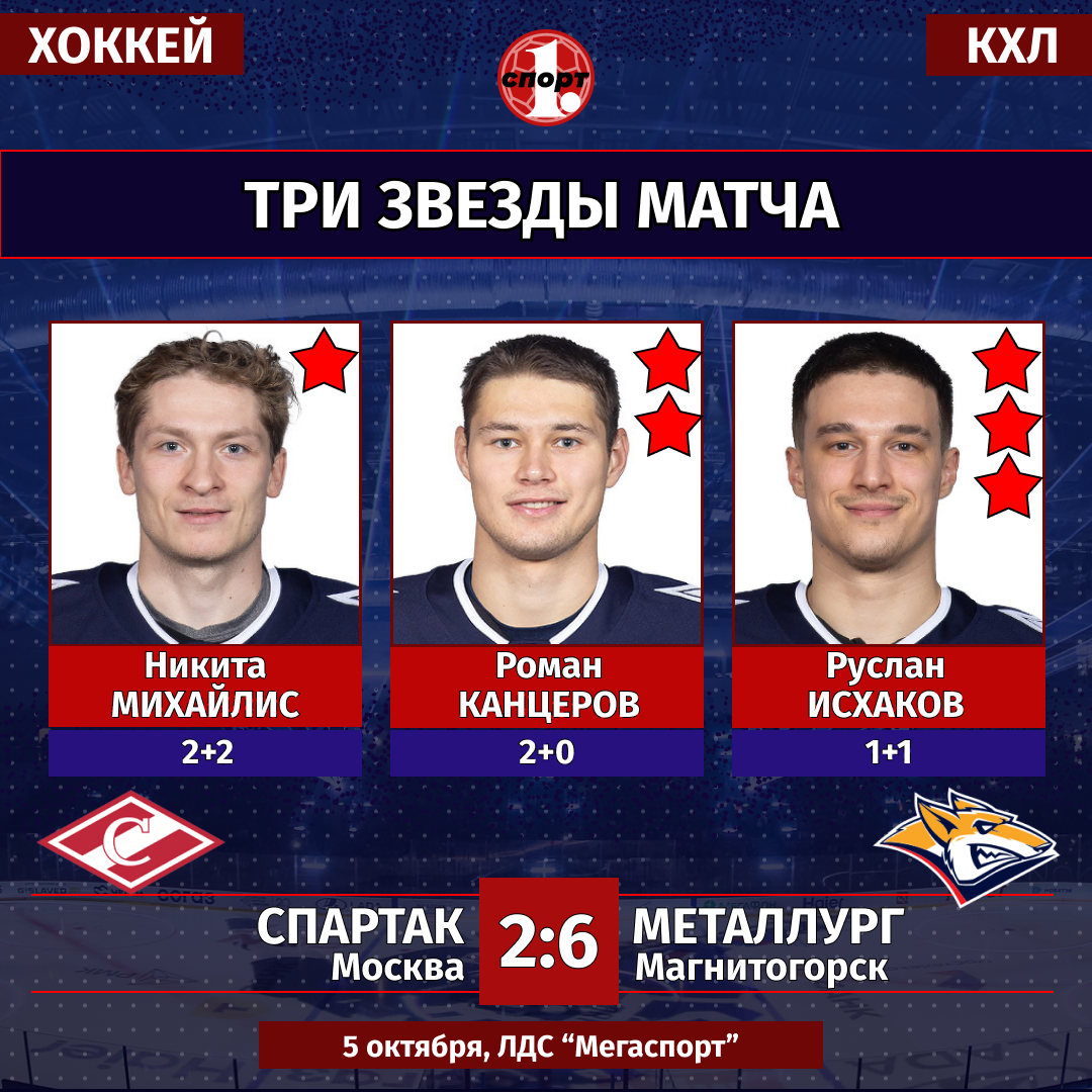 Хоккей. Чемпионат КХЛ. Сезон-2025/2026. 5 октября. «Спартак» (Москва) — «Металлург» (Магнитогорск) — 2:6 (1:2, 0:2, 1:2).