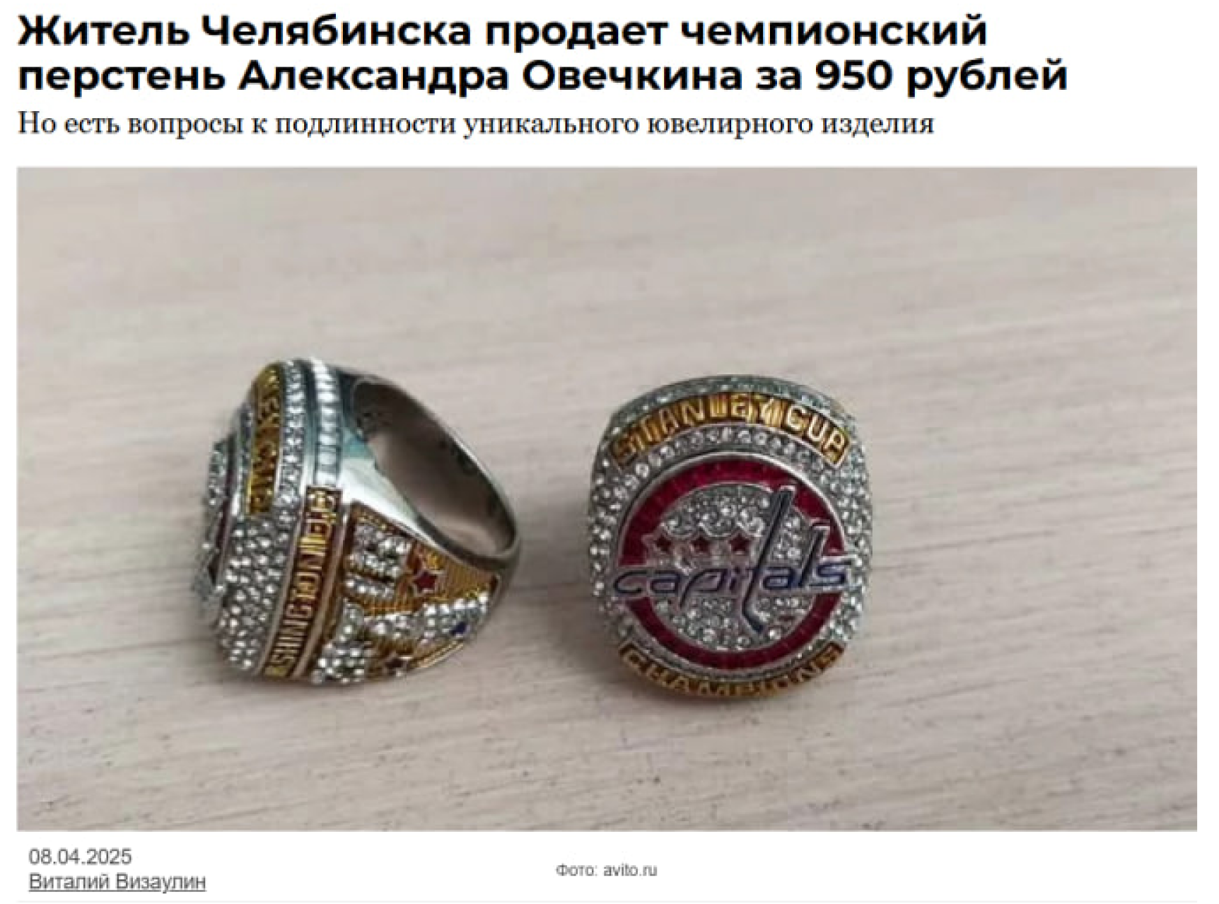 Среди лотов оказался и чемпионский перстень спортсмена за победу в Кубке Стэнли, а выставил его на продажу житель Челябинска. Почему-то именно это украшение вызвало большой интерес у читателей нашего сайта. Кстати, перстень не оригинальный, а подделка, и продавал его болельщик за 950 рублей. Выкупили его уже на следующий день.