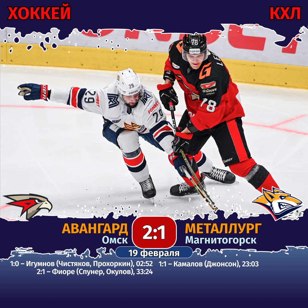 Хоккей. Чемпионат России. КХЛ. 19 февраля. «Авангард» (Омск) — «Металлург» (Магнитогорск) — 2:1 (1:0, 1:1, 0:0).