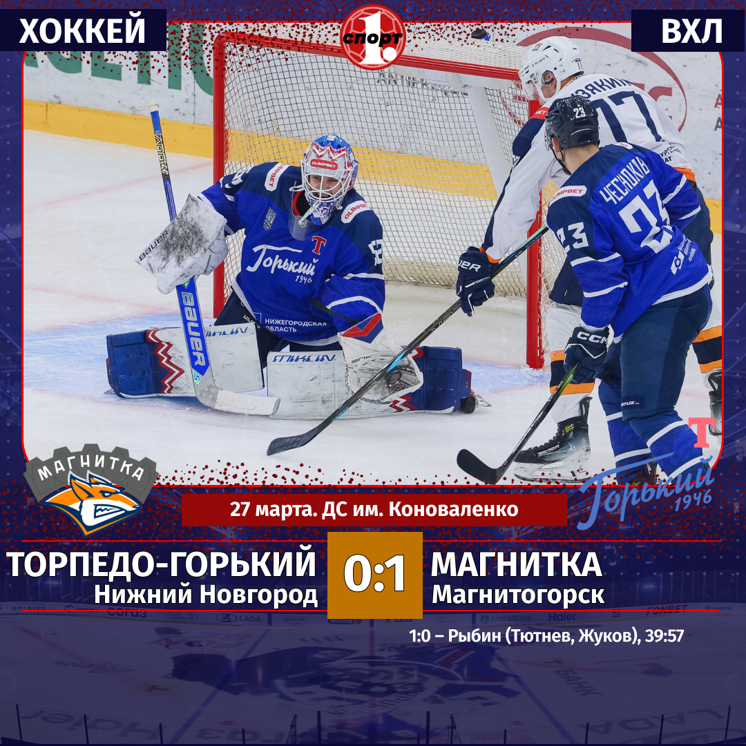 Хоккей. Сезон-2025/2026. ВХЛ. Плей-офф. 1/8 финала. Третий матч. 27 марта. «Торпедо-Горький» (Нижний Новгород) — «Магнитка» (Магнитогорск) — 0:1 (0:0, 0:1, 0:0).