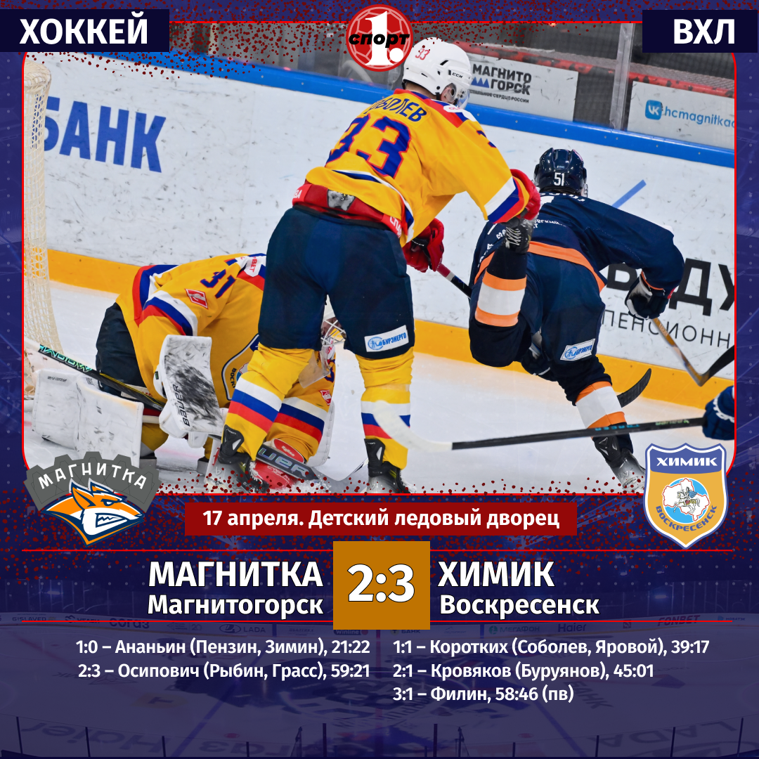 Хоккей. Сезон-2025/2026. ВХЛ. Плей-офф. Четвертьфинал. Четвертый матч. 17 апреля. «Магнитка» (Магнитогорск) — «Химик» (Воскресенск) — 2:3 (0:0, 1:0, 1:2).